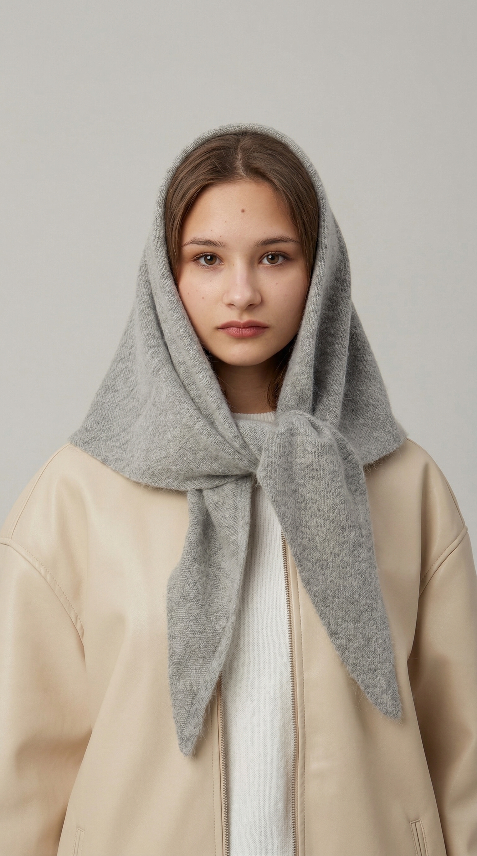 Оригинальная косынка — выглядит интереснее приевшейся шапки. Эту вещь можно накидывать на плечи или завязывать как платок. Данный аксессуар можно сочетать как с базовым гардеробом, так и со спортивным. Косынка выполнена из ангоры, напоминающей старинные пуховые платки, только вязка не содержит рисунка.