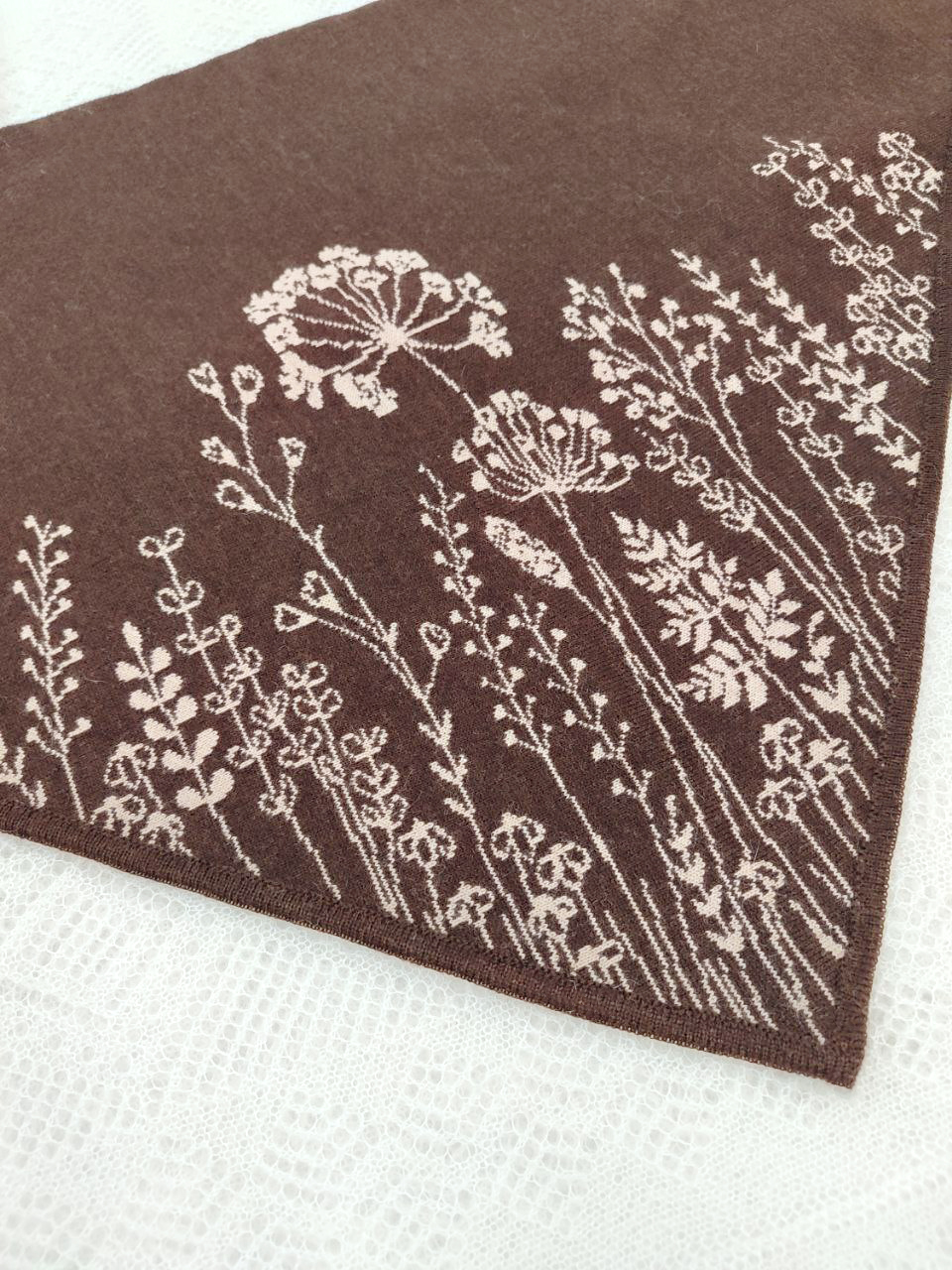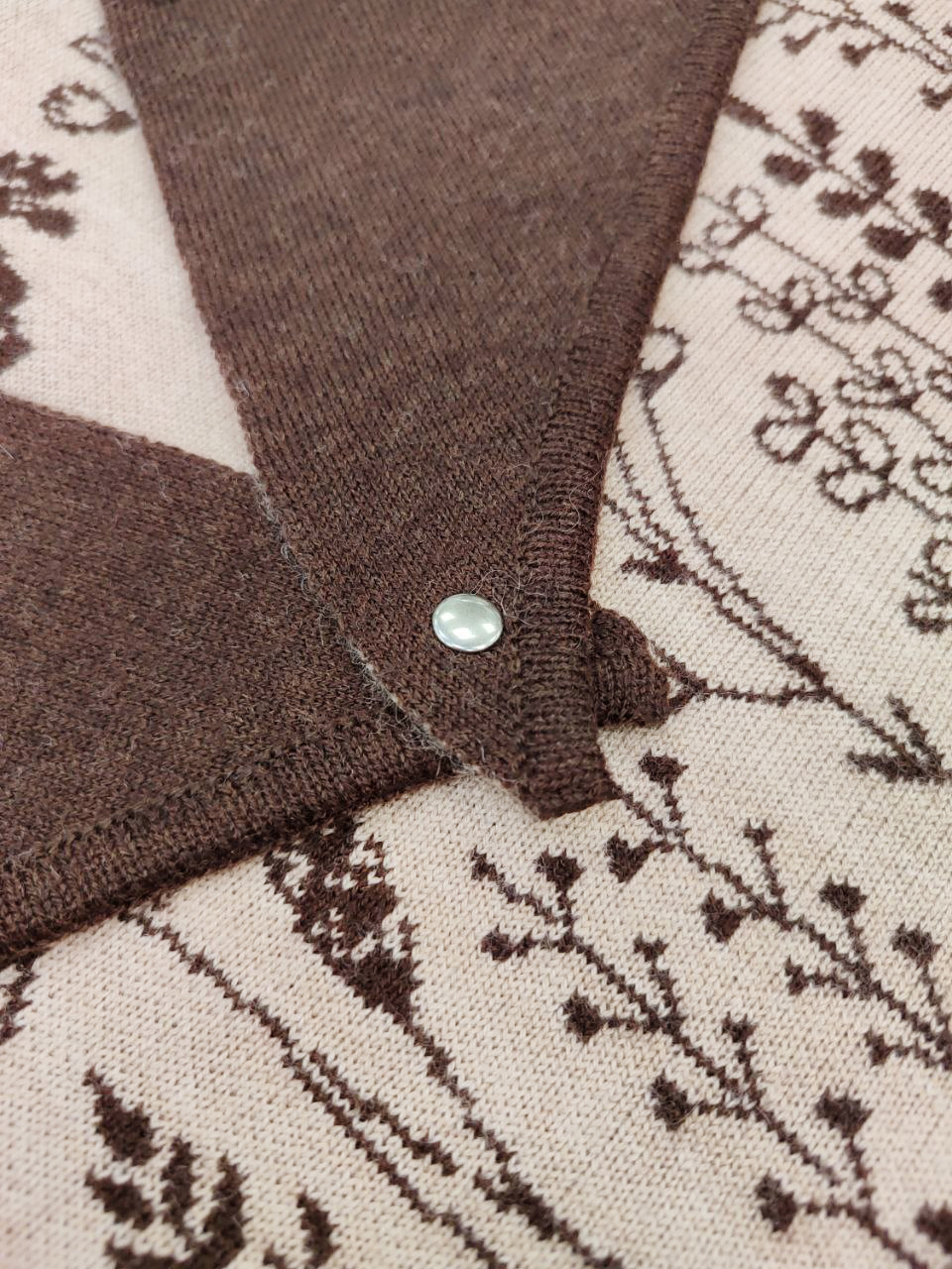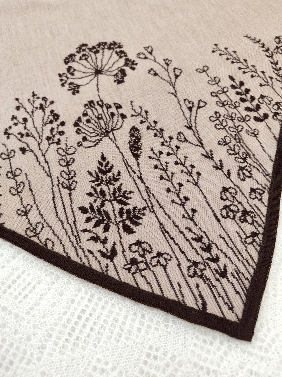 Шерстяная косынка интересного дизайна! Двухсторонняя, с нежными узорами, с одной стороны приятного бежевого цвета, с другой - цвета насыщенного темного шоколада . Имеет кнопку-фиксатор на уголках, что позволяет аккуратно закреплять косынку на голове, не завязывая объемный узел. Косынка удобного среднего размера, плотной фактуры. Можно сочетать с бежевой, синей, коричневой, зеленой верхней одеждой.