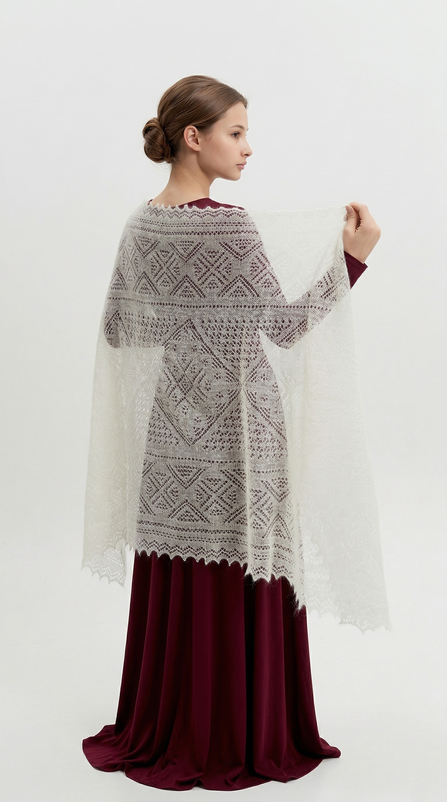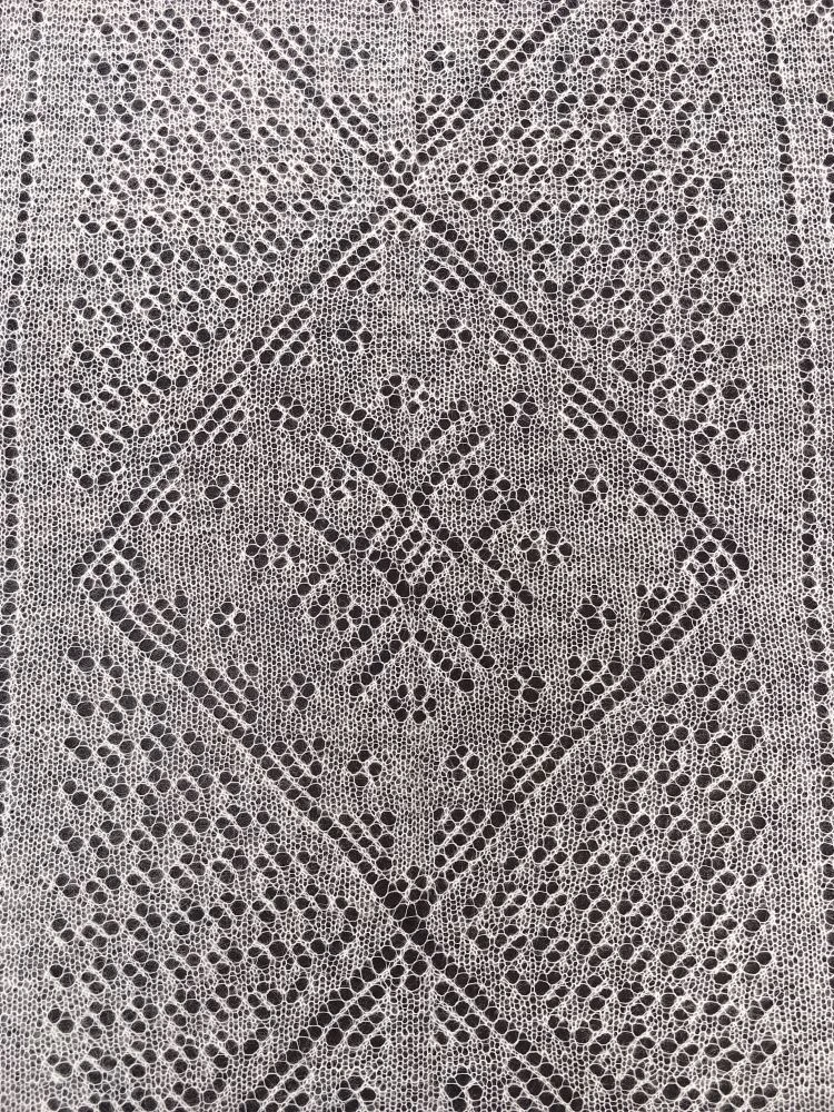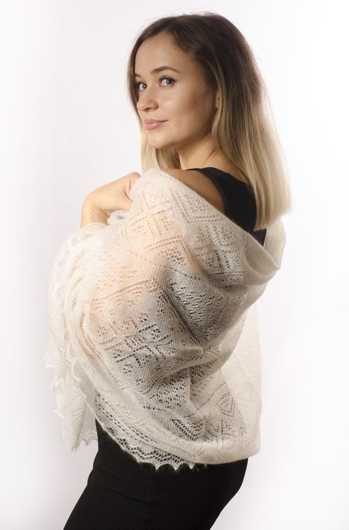 Данный пуховый палантин очень тонкий и воздушный, изготовлен на вискозной нити-основе. Размер этого изделия позволяет его носить на голове вместо платка, накручивать на шею, дополнять образы в прохладных помещениях. Палантин не только теплый, но и очень красивый. Во время ношения на плечах хорошо просматриваются его необыкновенные узоры, состоящие из снежинок, ромбов, елочек и каймы, обрамленной нежными зубцами. Прямоугольная паутинка в цвете экрю добавит свежести любому образу.