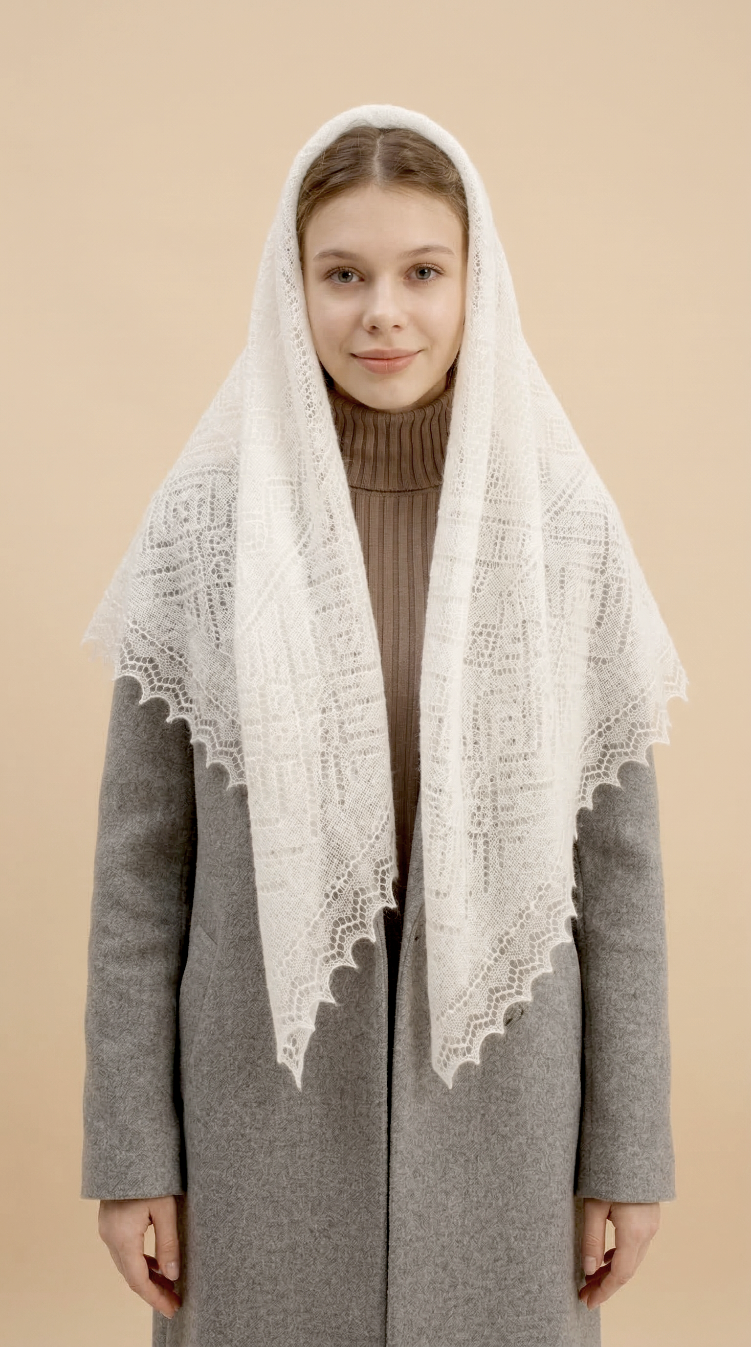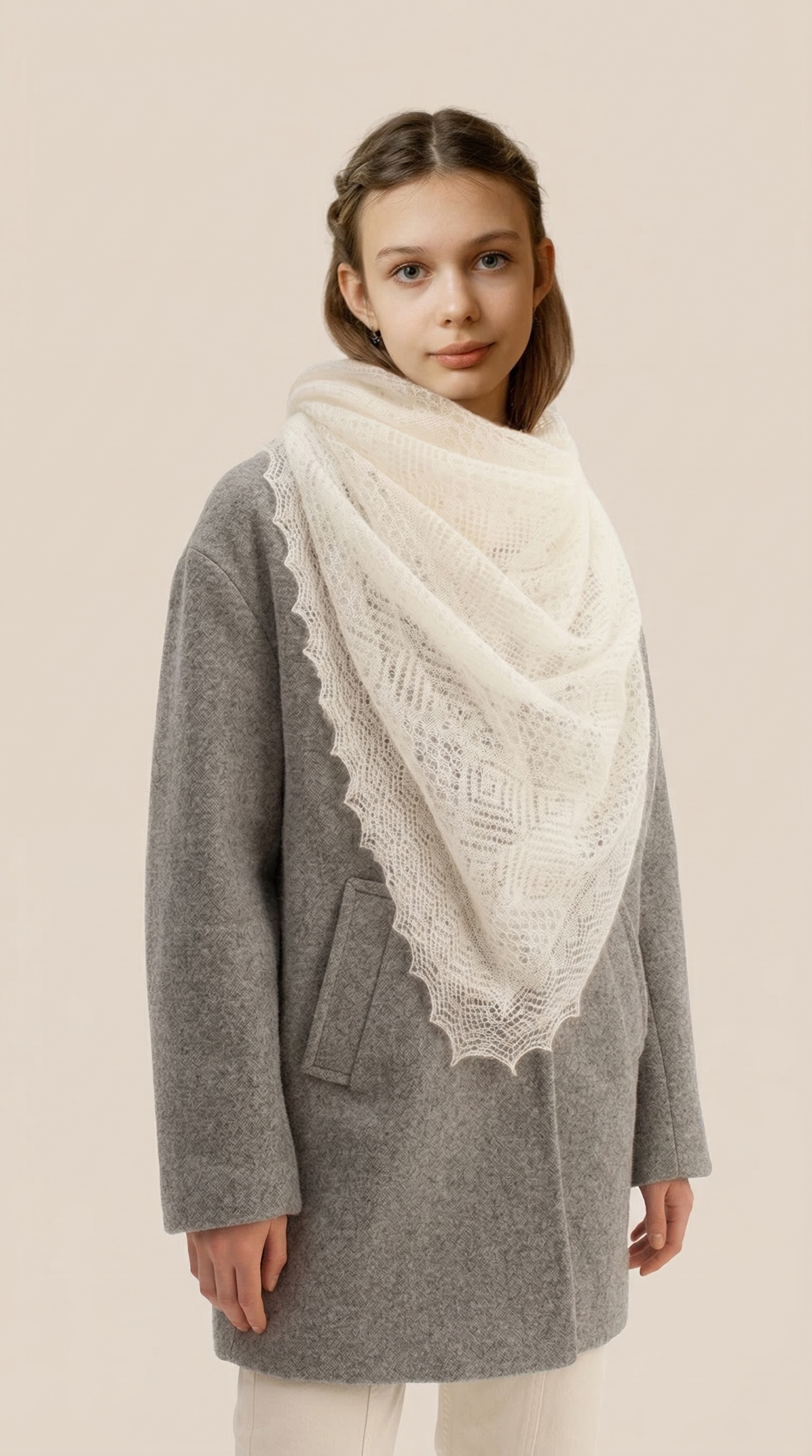 Ажурная паутинка с изысканным узором, выполненная из козьего пуха натурального цвета с добавлением шёлка. Мягкая, невесомая и очень тёплая, она прекрасно дополняет как повседневные, так и вечерние образы. Её можно носить на голове, накидывать на плечи или повязывать под верхнюю одежду. Натуральный шёлк придаёт платку особую нежность и утончённый блеск, добавляя изделию лоска и аристократичности. Размер и цвет изделия являются универсальными, поэтому вы можете выбрать его для подарка; если же вы ищете платок большего размера, советуем рассмотреть ажурную паутинку АШ140-02 цвета экрю.