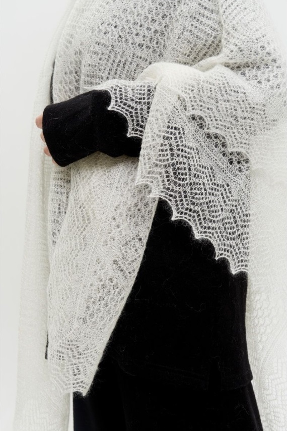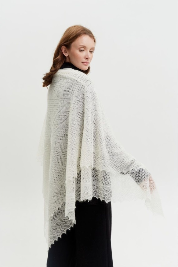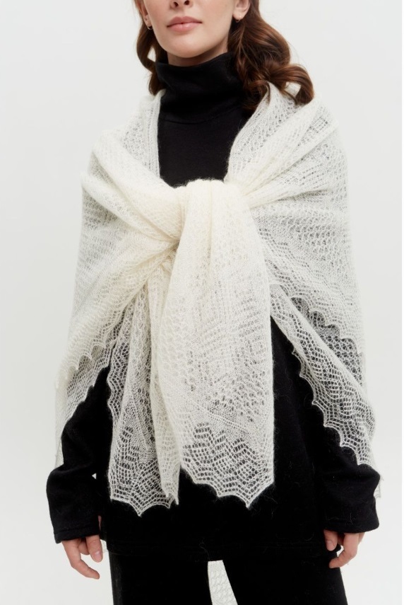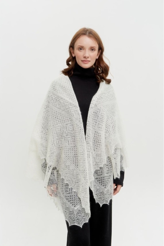 Изящная ажурная паутинка с полностью натуральным составом. Благодаря наличию в составе большого процента шёлка, это изделие очень мягкое и струящееся, невесомое, но очень тёплое! Платок выполнен в среднем размере 140х140 см, благодаря чему красиво лежит на плечах, ниспадая нежными складками и придавая образу особую стать и грациозность.