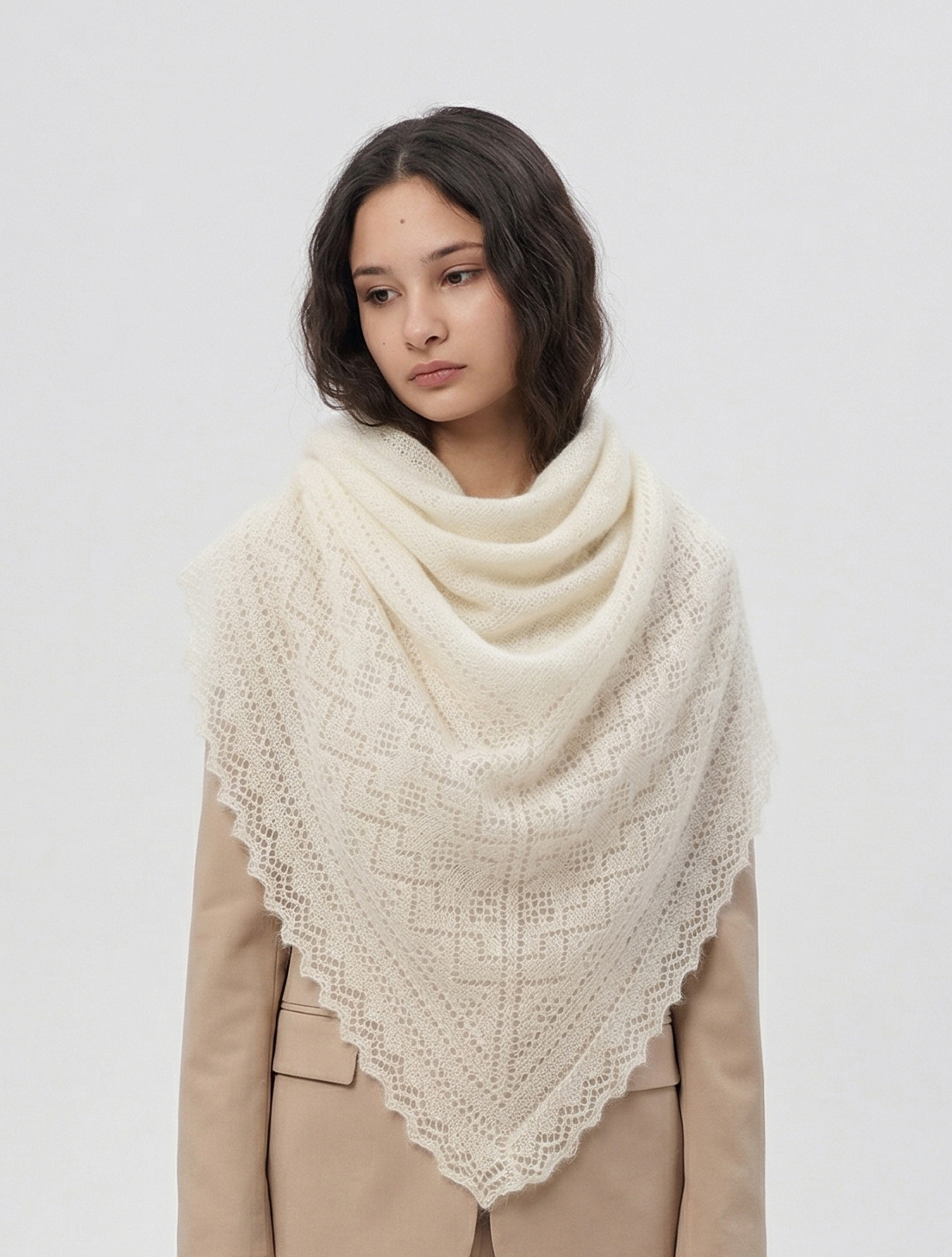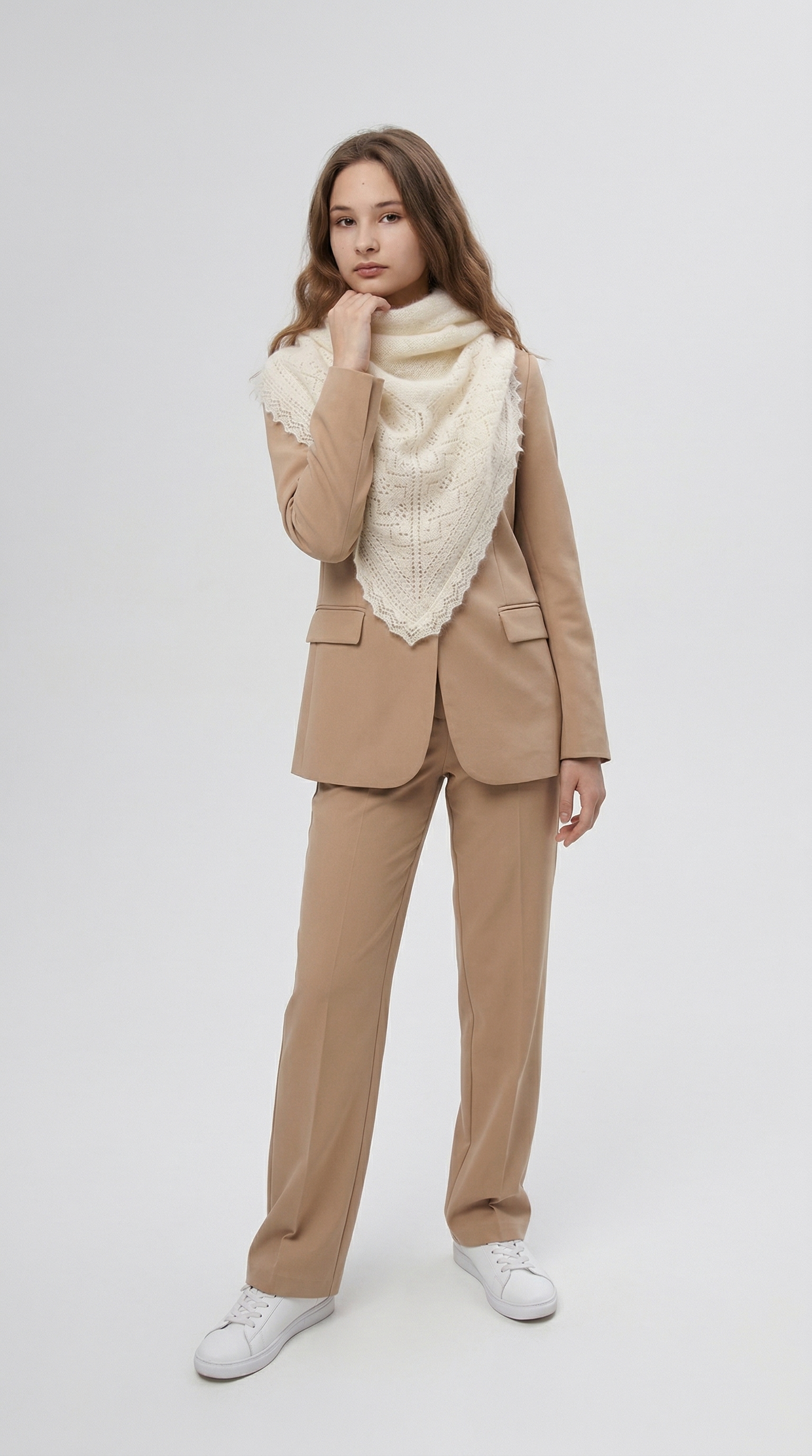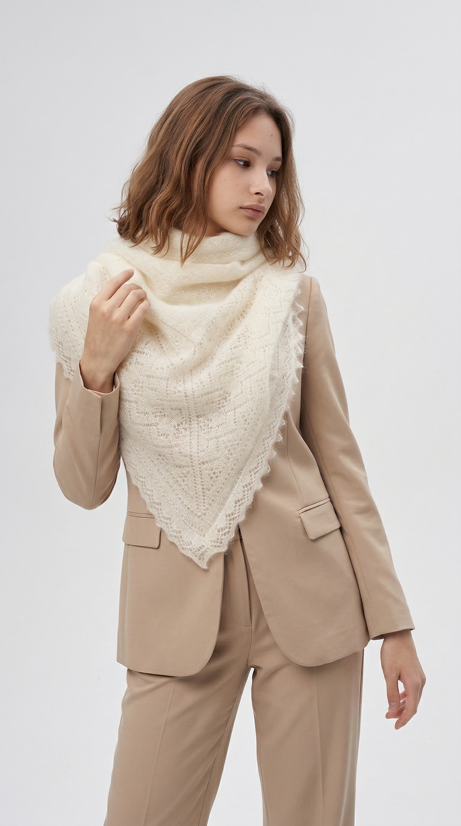 Уплотненный пуховый платок имеет по краю красивый узор, центр вывязан гладью без ажура для наибольшего сохранения тепла. При вязании данной модели используется толще нить и больше козьего пуха, отчего ощущается быстрый согревающий эффект. Полиамид - прочная тонкая нить, которая не дает деформироваться изделию, продляет износостойкость, упрощает уход и не утяжеляет изделие, в составе платка содержится в небольшом проценте, что никак не влияет на его тепловые функции, но делает привлекательнее цену. Цвет экрю или натуральный белый считается визитной карточкой оренбургского платка, так как является классикой и ассоциируется с зимой, подойдет к любому типажу внешности, а также освежит и украсит любой образ.