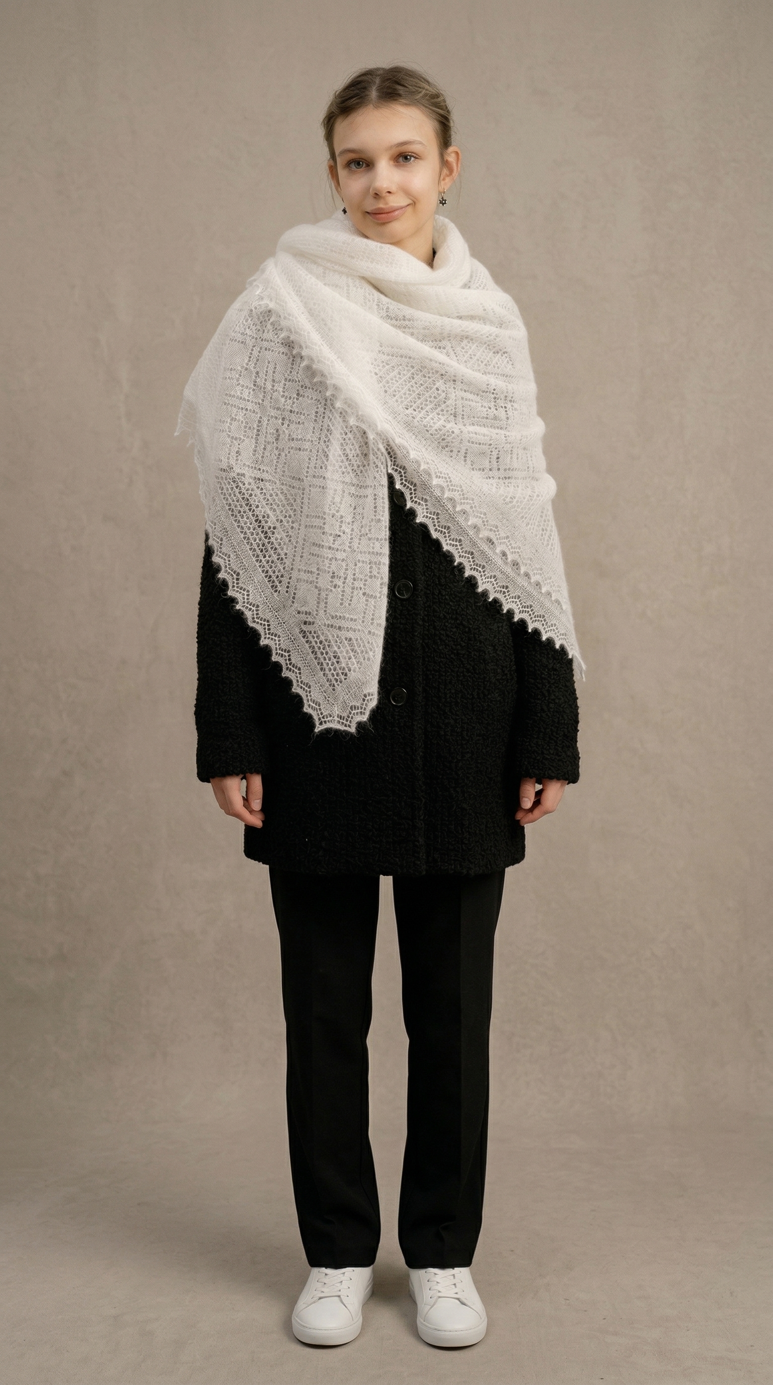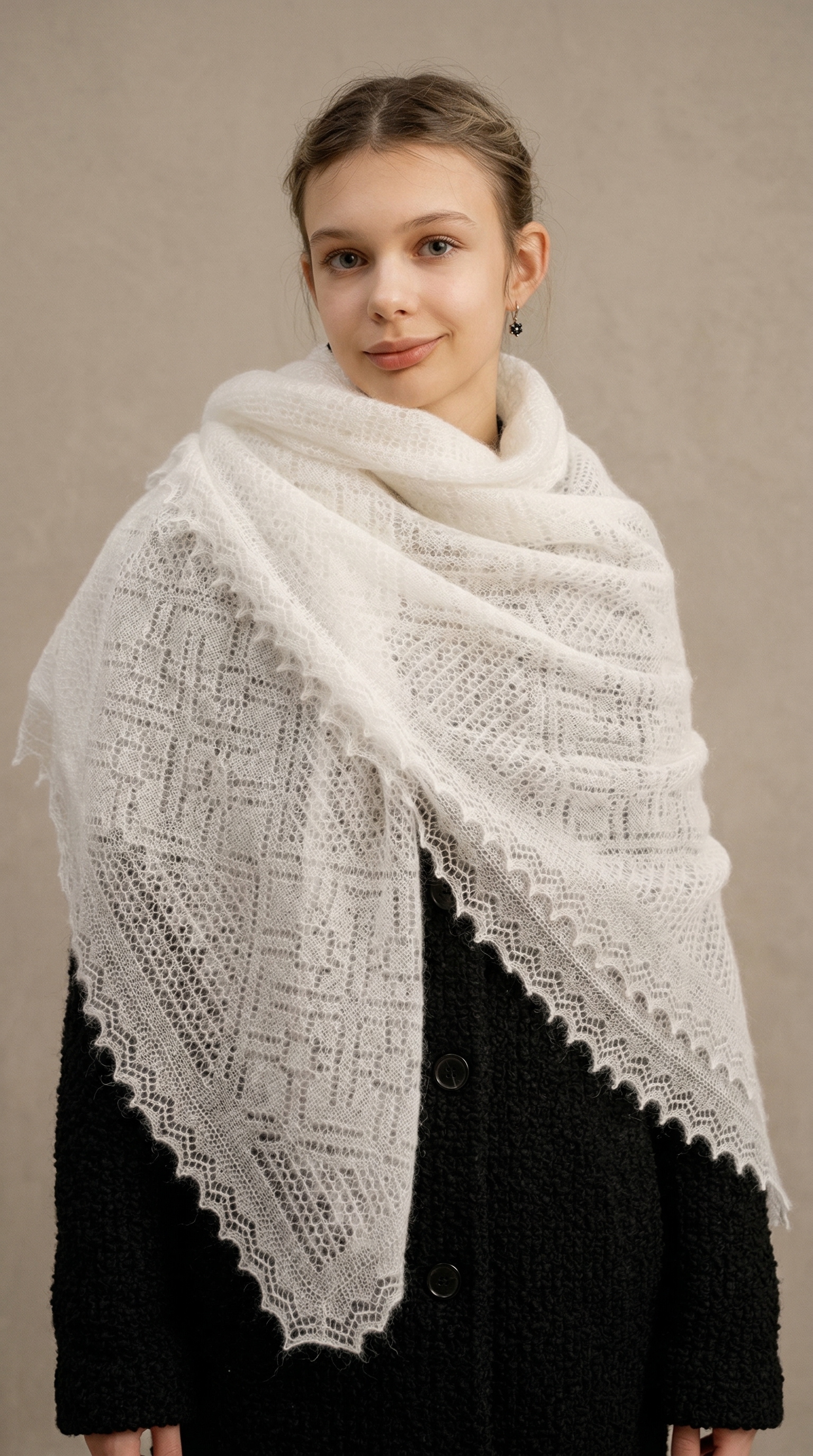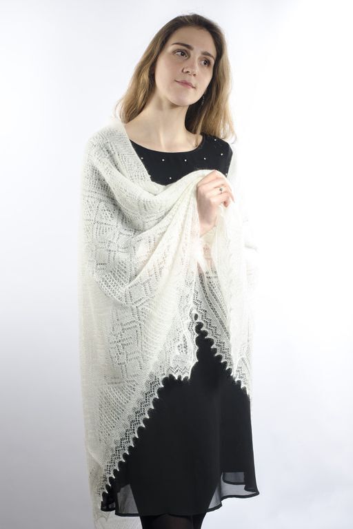 Ажурная невесомая паутинка.Благодаря уникальным особенностям козьего пуха вяжется тончайшее, полупрозрачное, воздушное, невесомое, словно легкая паутинка-ажур из бабьего лета. Изделие, отличающееся не только сказочной красотой, но и теплотой, мягкостью, особой нежностью и завидной прочностью.