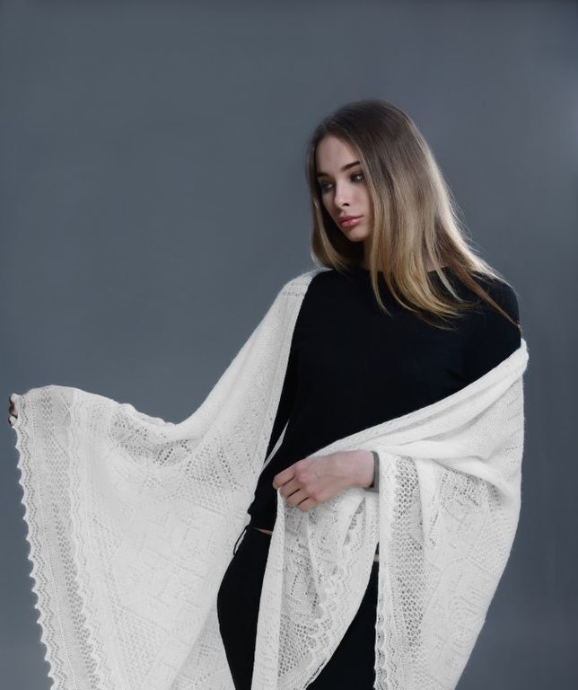 Это самая большая и представительная паутинка в цвете экрю у Фабрики Оренбургских пуховых платков. Неокрашенное натуральное изделие очень мягкое и приятное на ощупь. Так и хочется прикоснуться, закутаться, накинуть на плечи. Паутинка полностью ажурная, по всему полю тянутся орнаментальные кропотливые узоры. Она настолько великолепна,что невесты дополняют ею свои свадебные наряды в морозные дни.