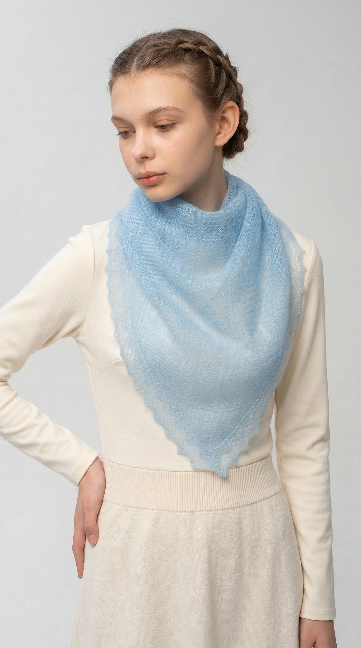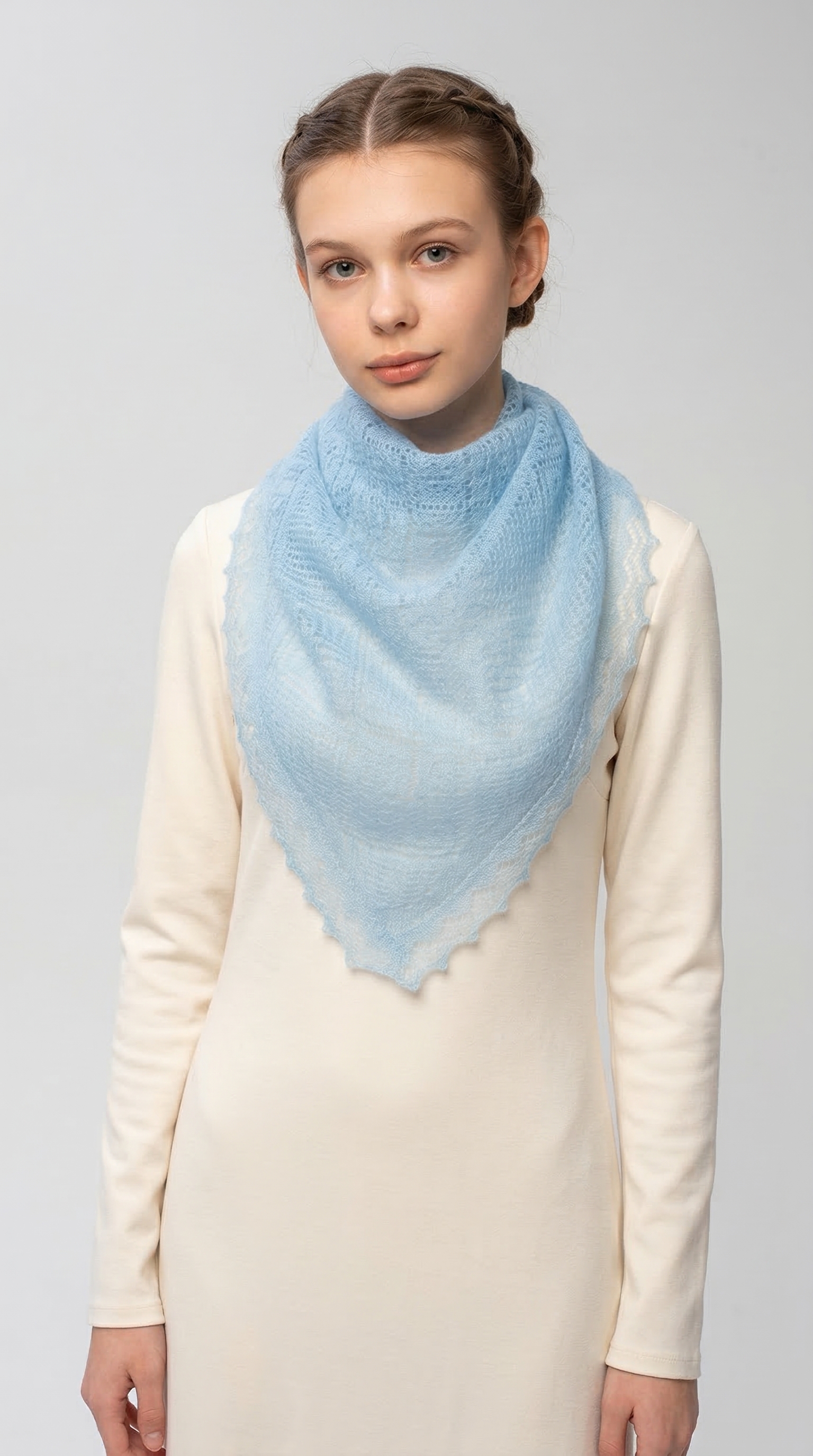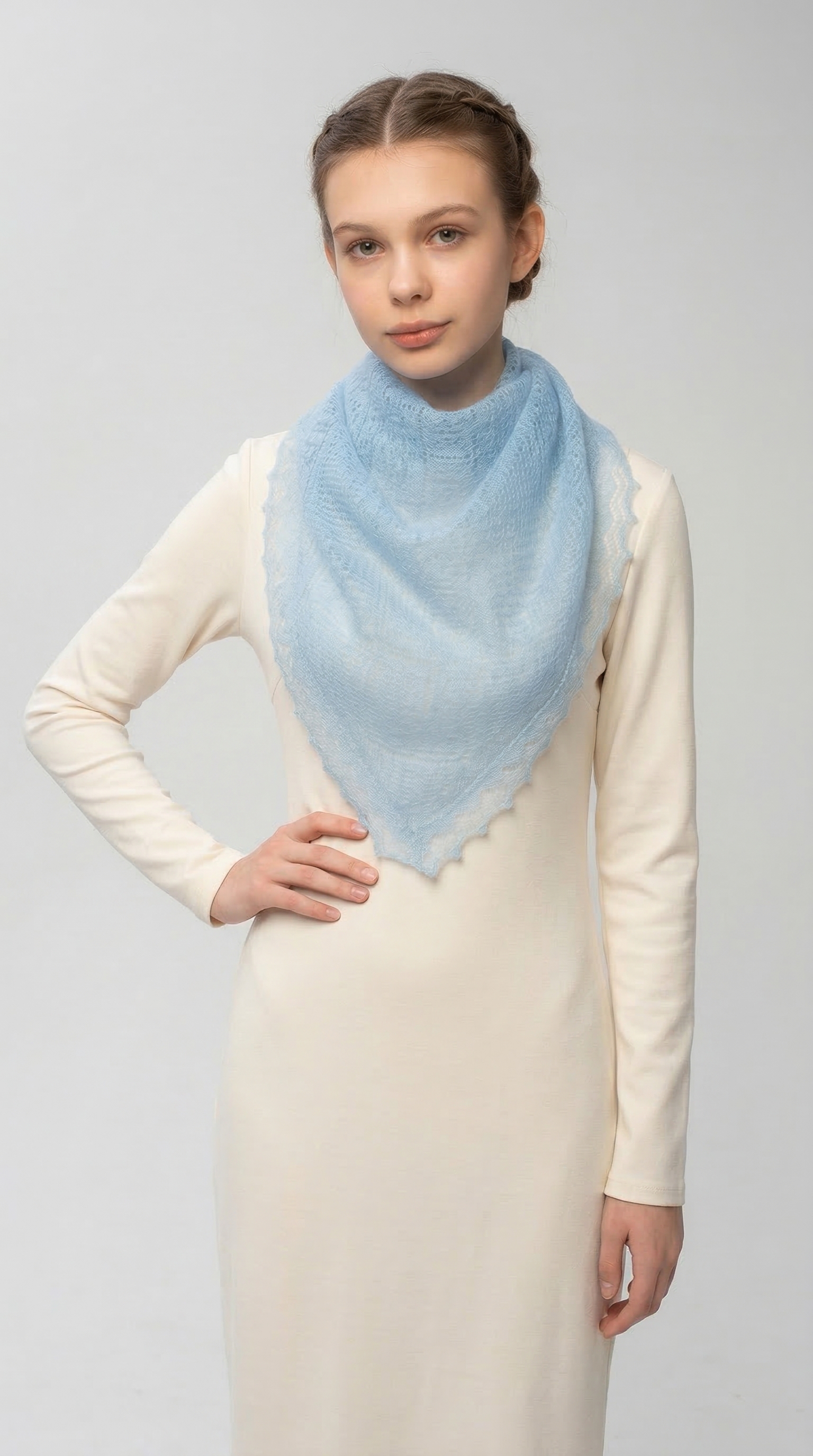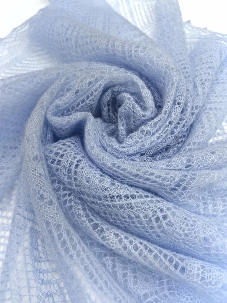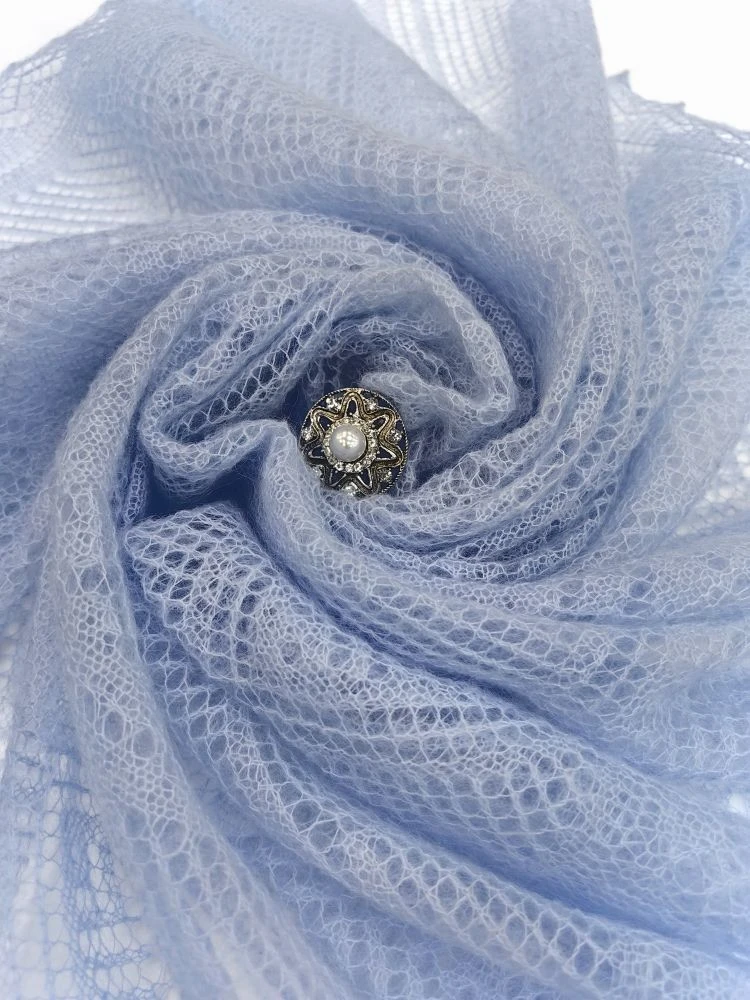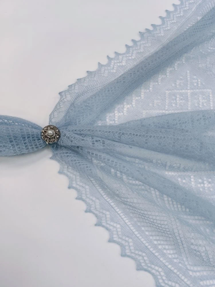 Маленький ажурный платок в нежном голубом цвете.Цвет, который мы выбираем для нашего образа, может узнать многое о нашем характере и настроении. Одним из самых романтических и пронзительных цветов является голубой.Люди, выбирающие этот цвет, выбирают стремление к миру и гармонии в своей жизни. Чаще всего такие люди являются очень миролюбивыми. Кстати, голубой цвет очень располагает и положительно влияет на вашего собеседника.