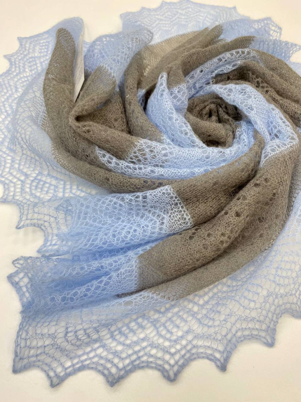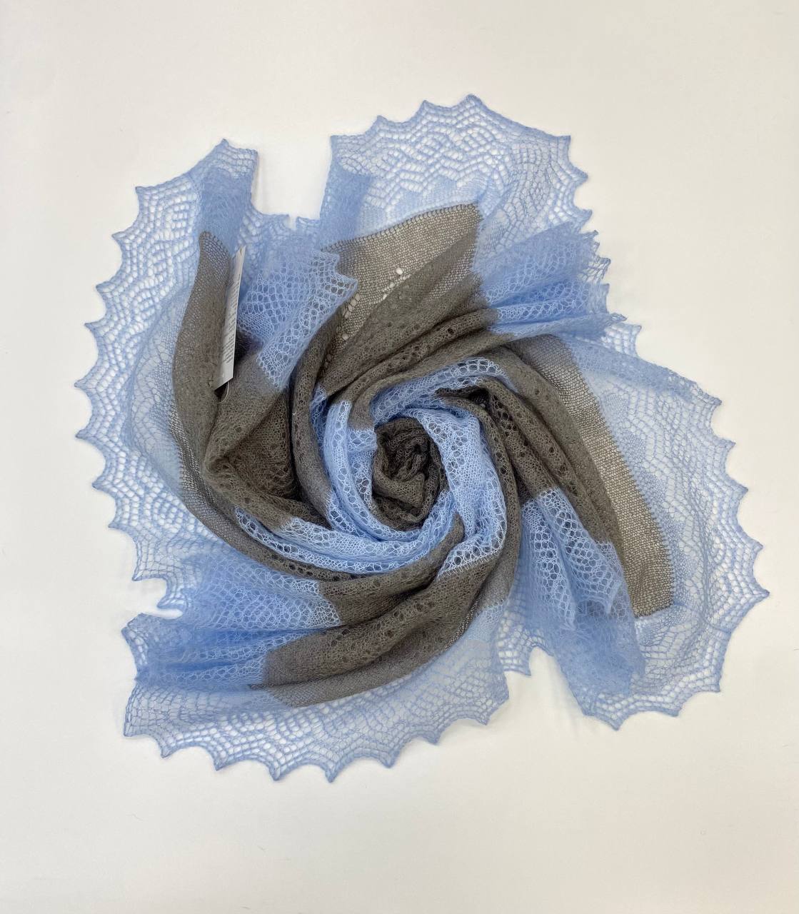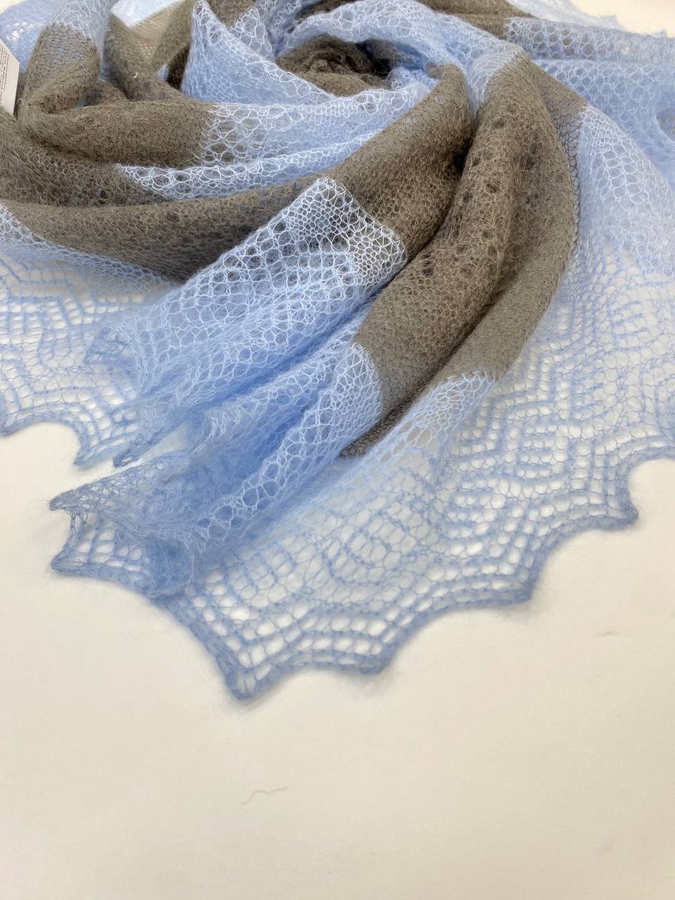 Платок в серо-голубом оттенке, так же как и наши модели в другой цветовой комбинации, изумительно смотрятся благодаря пересечениям 2-ух цветов. Холодный голубой цвет и мягкий серый необычно сочетаются. Стоит вам только примерить такой платок, вы точно оцените задумку наших дизайнеров.
