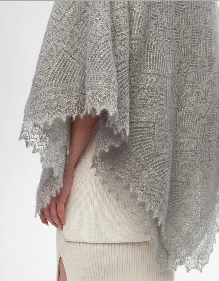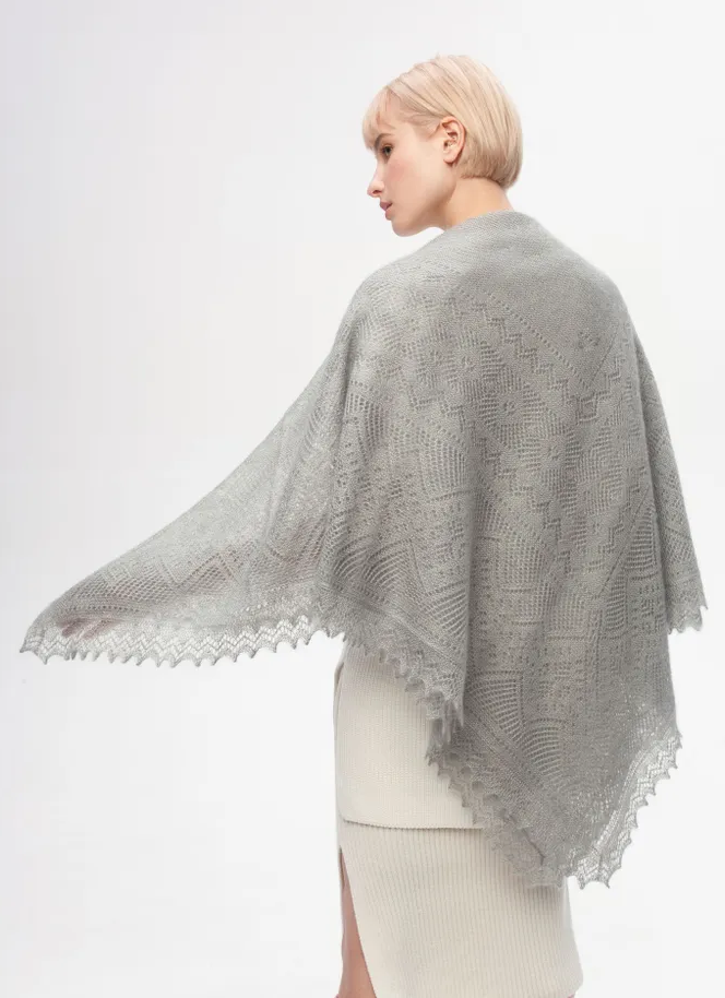 Уплотненный пуховый платок на шелковой основе имеет красивый узор, тщательно вывязанный по краю, который придает изделию неповторимость. Для наибольшего сохранения тепла центр вывязан гладью без ажура. Платок очень теплый благодаря толстой нити и большему, по сравнении с пуховой паутинкой, количеству козьего пуха, используемому при изготовлении изделия. Натуральный шелк, обладающий своей уникальной текстурой, наделяет изделие прочностью и долговечностью, одновременно придавая ему легкость и элегантность.