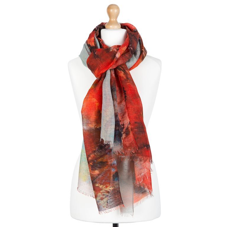 Алые маки ярким пламенем горят на спокойном серо-голубом фоне палантина. Очень живой и выразительный рисунок впечатляет воображение, ярким акцентом украшая повседневные образы. Палантин подходит женщинам любого возраста и цветотипа, он придаёт приятный румянец тону кожи и подчеркивает природные данные своей обладательницы.
