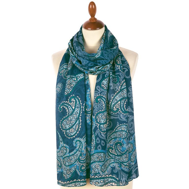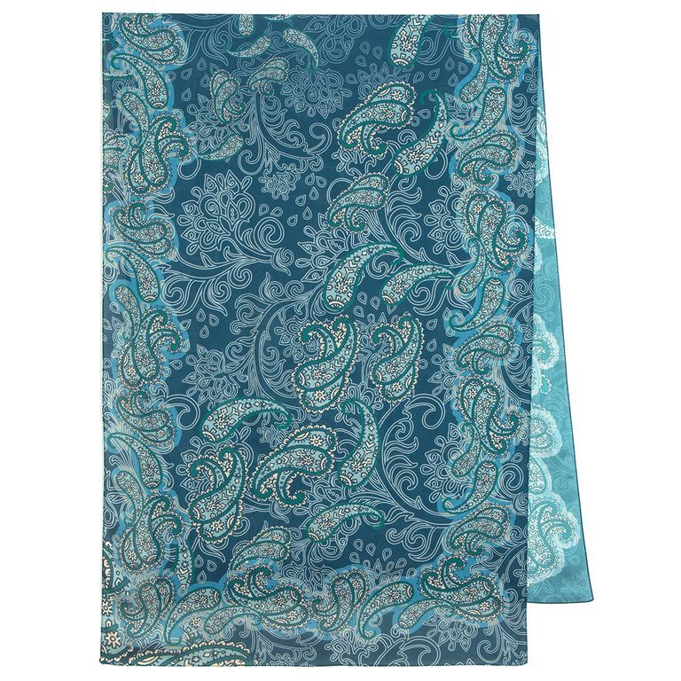 Хит продаж! Насыщенный бирюзовый тон палантина искусно украшен золотыми орнаментами и светло-голубыми прожилками, которые придают изделию воздушность и выразительность. У палантина достаточно большой размер, его можно носить на голове, накидывать на плечи или наматывать вокруг шеи. Вискоза – натуральный материал, полученный из древесины хвойных пород, поэтому в нём комфортно и прохладно в жаркие дни.