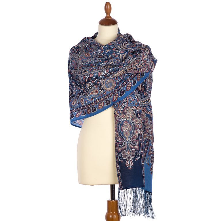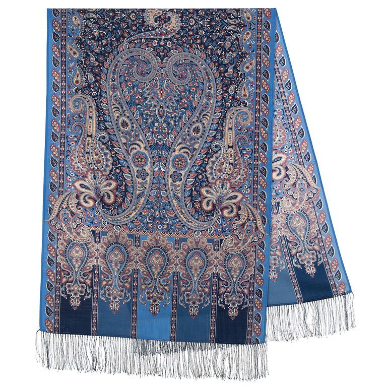 Один из любимчиков наших покупателей, этот палантин вобрал в себя самые лучшие качества – яркий универсальный орнамент, состоящий из витиевато переплетённых восточных огурцов пейсли, ваши любимые оттенки: синий, голубой, бежевый и бордовый, натуральный состав из 100% шерсти и удобный большой размер. Аксессуар, который точно придётся вам по душе, согреет в прохладную погоду и подарит хорошее настроение.
