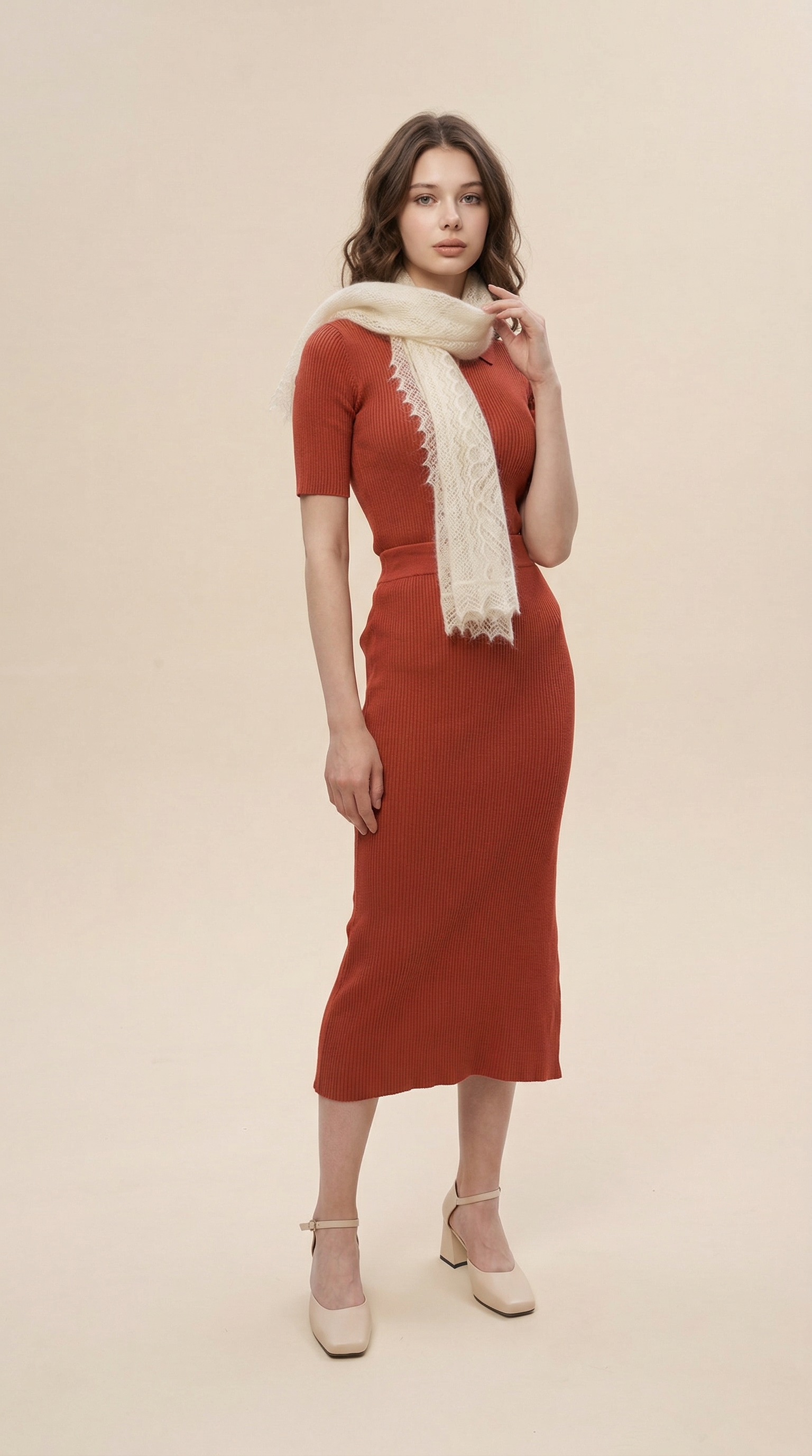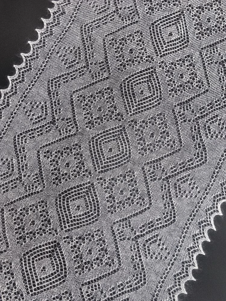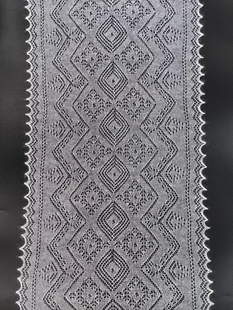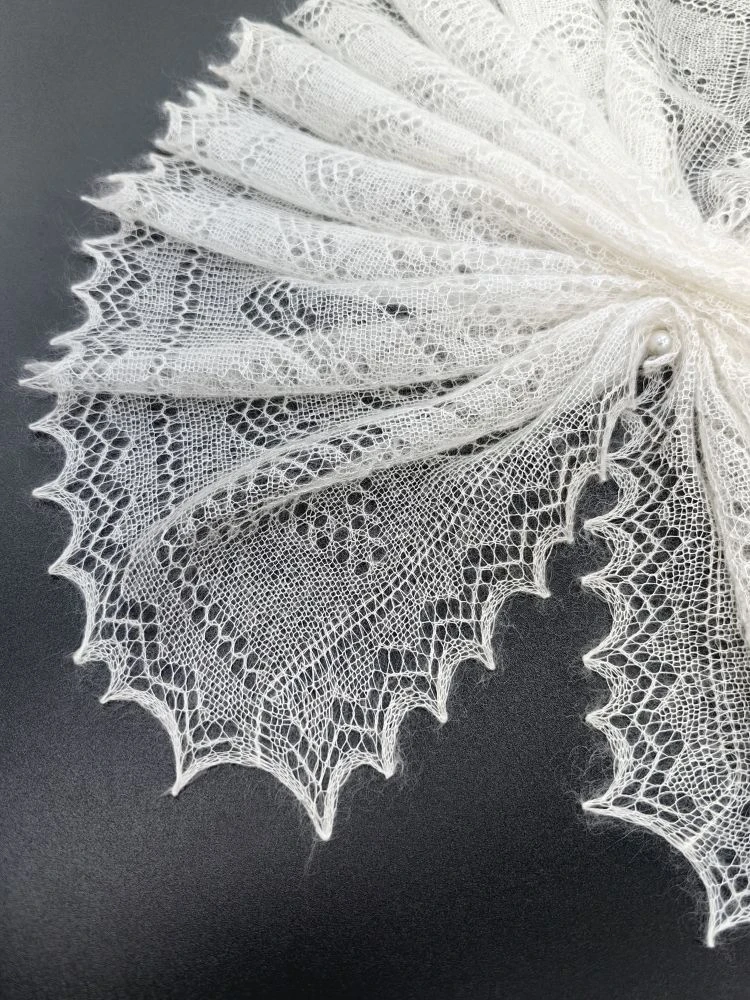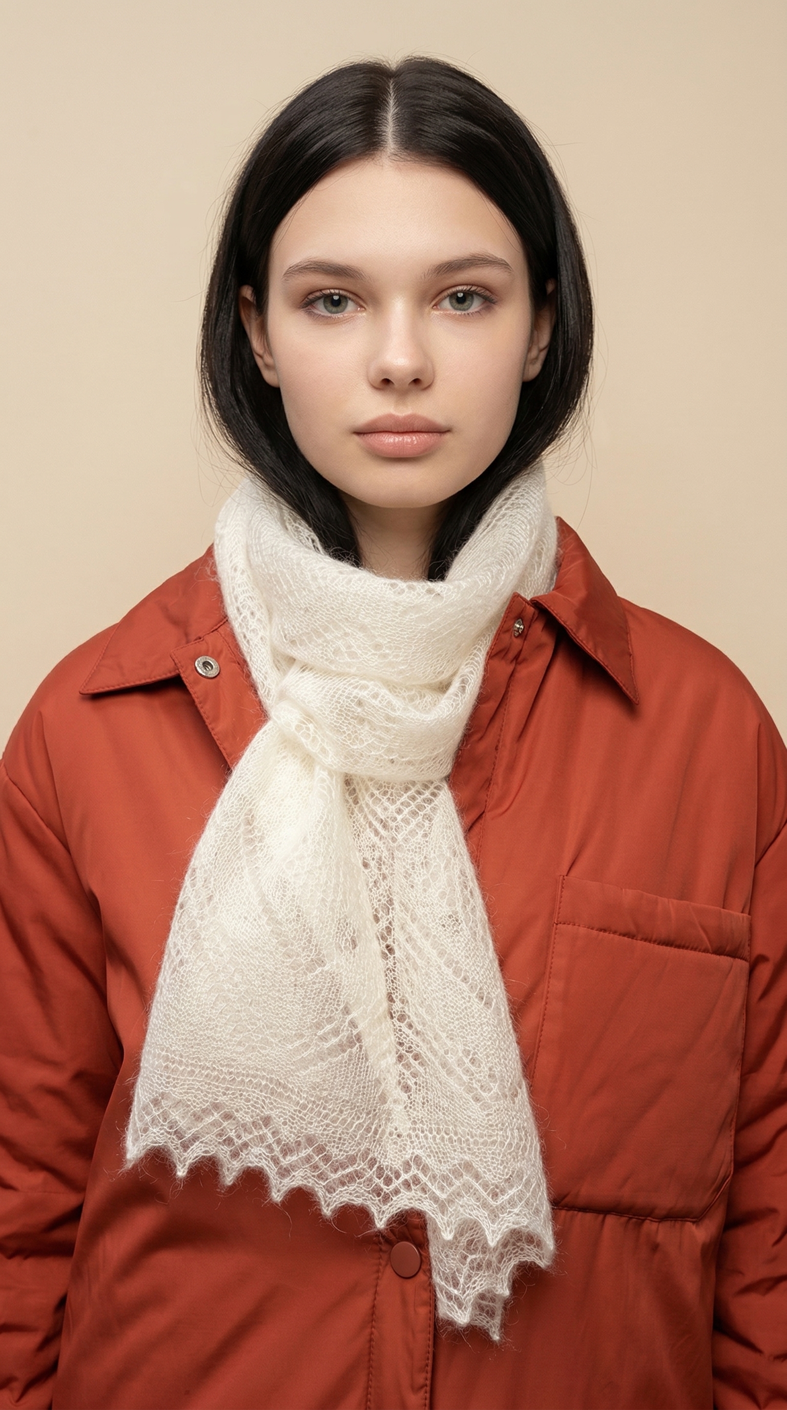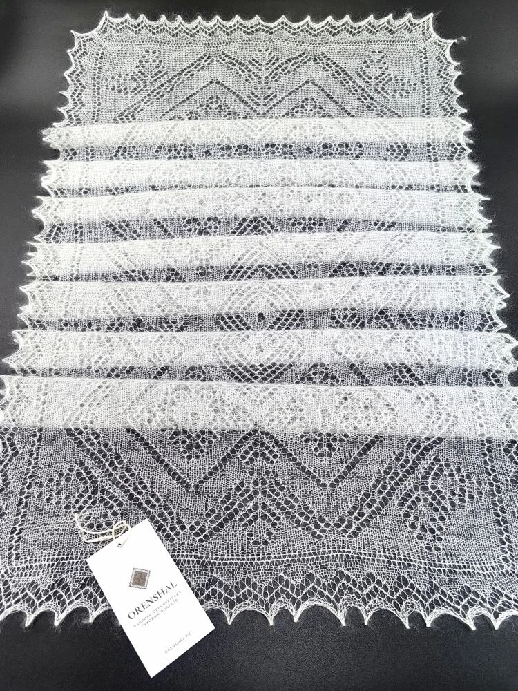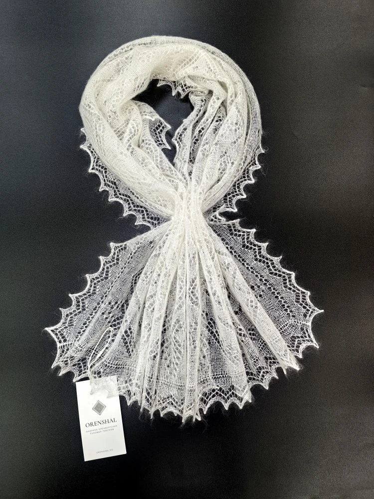 Небольшой ажурный шарфик естественного молочного цвета. Его отличительная черта – натуральный шёлк в составе, благодаря этому изделие очень мягкое и воздушное, с неповторимым шёлковым блеском и особыми пластичными свойствами. Шарф относится к категории ажурных паутинок, проходящих через колечко, но, несмотря на его изящество и невесомость, он прекрасно согревает и защищает от ветра. Если ваша верхняя одежда имеет открытую воротниковую зону, можно намотать шарфик на шею для защиты от непогоды, а для вечерних образов рекомендуем вам испробовать необычные способы завязывания шарфа с кольцами и чудо-пуговицами, превращающими любой аксессуар в настоящее произведение искусства!