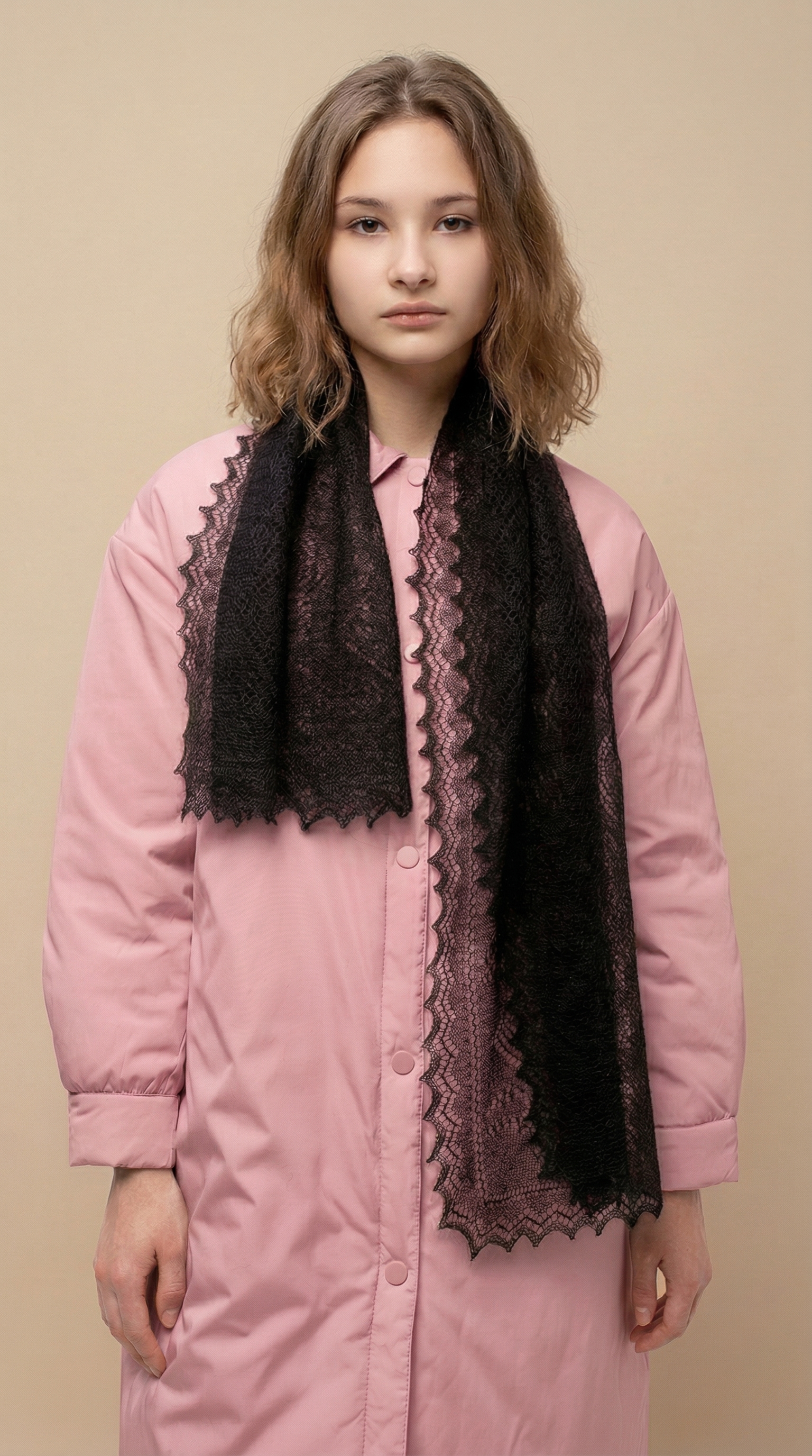 Универсальный нежный шарфик в благородном чёрном цвете. Натуральный шёлк в составе придаёт изделию особую нежность и пластичность, благодаря которым изделие мягко струится, обволакивая хозяйку теплом и уютом. Платок идеально подходит для верхней одежды с открытым горлом, создавая защиту от непогоды без чрезмерного объёма; также его можно использовать как акцентный аксессуар, завязывая необычными способами в виде банта или цветка при помощи колец и чудо-пуговиц из нашего ассортимента.