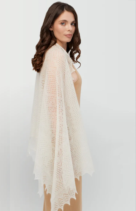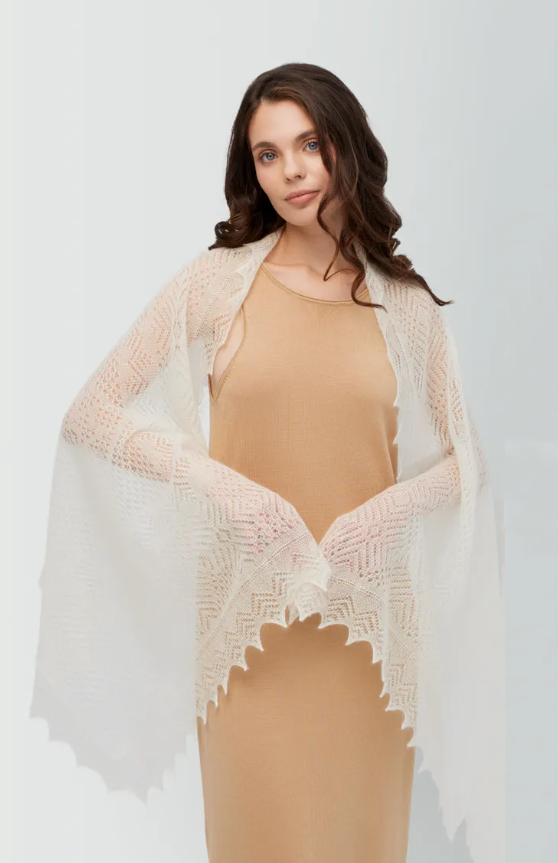Ажурный пуховый палантин с добавлением натурального шёлка. Благодаря большому размеру, палантин шикарно смотрится на плечах и прекрасно дополняет вечерние образы, удивляя не только своей изысканной красотой, но и отличными согревающими свойствами. Палантин имеет богатый орнамент и необычные удлинённые зубцы по краю изделия, придающие ему неповторимый стиль.