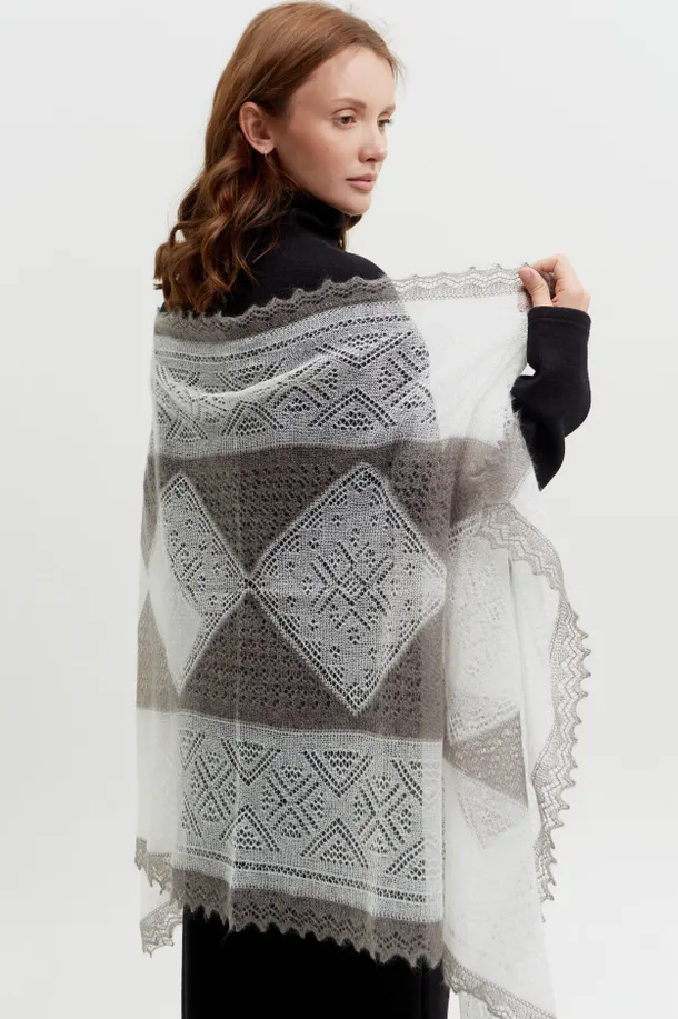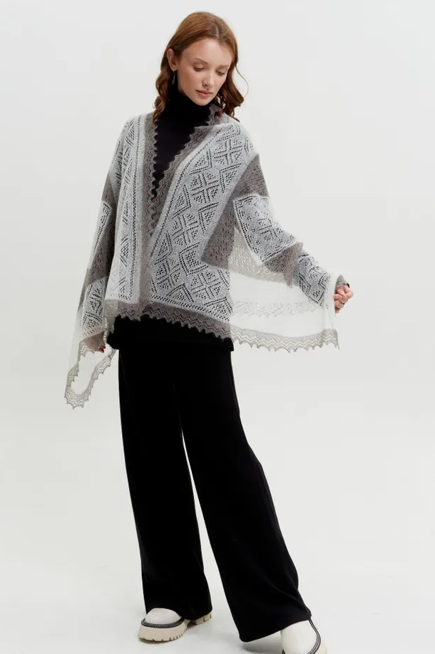 Оренбургский пуховый палантин легкий и воздушный, изготовлен на вискозной основе. Этот размер изделия позволяет его носить на голове вместо платка, повязывать на шею, дополнять образ делового стиля, романтического. Палантин не только теплый,но и очень красивый .Благодаря комбинированному цвету палантина он очень оригинально смотрится как в намотке, так и просто на плечах. Основной цвет этой модели - белый. Также есть модель палантина с преобладающим серым цветом. Выбирайте, что ближе вам, и согревайтесь и украшайте себя нашими пуховыми изделиями.