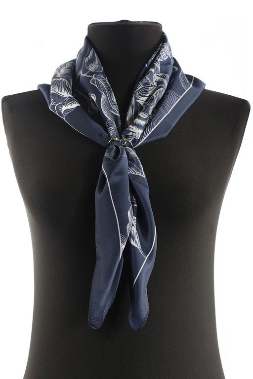 Минималистичный и графичный платочек. Рисунок будто выгравирован белым контуром на темно-синем фоне. Тонкие и плавные линии образуют нежнейший ажур растительных орнаментов. В колорите использовано всего два цвета - универсальный платок, который нередко берут мужчины в качестве нагрудного платка для пиджака.