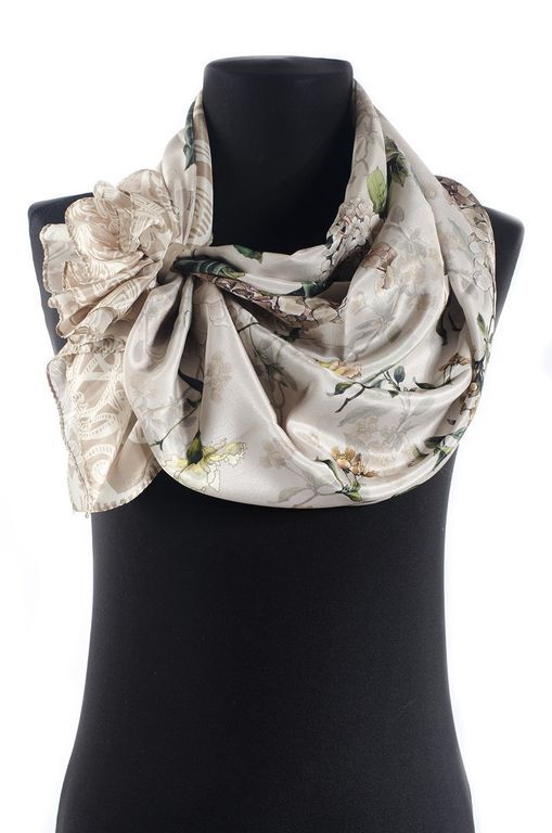 Нежнейший кружевной орнамент по кайме, монохромное сочетание молочно-бежевых оттенков, с утонченными веточками гортензий и цветущей яблони, с приглушенной зеленью - картина, а не платок! Рисунок, который хочется рассматривать и восторгаться. Утонченный колорит для спокойных и изящных девушек!