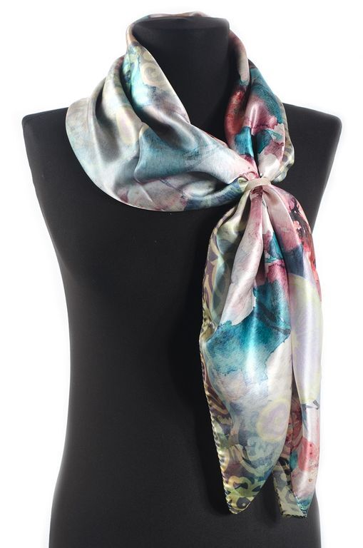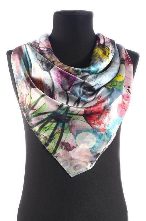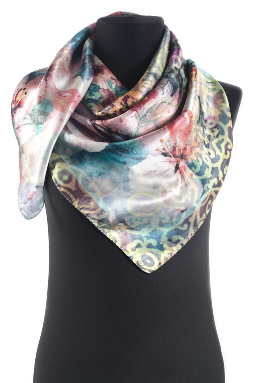 В свойственной стилистике, автор сочетает, казалось бы несочетаемые элементы в рисунке. Тут и нежные цветочные силуэты, и яркие акцентные лимончики и дорогие вензеля! Необычная композиция с наложением друг на друга элементов рисунка, смотрится невероятно красиво и современно, а когда это представлено в чудесном сочетании цветов, непременно хочется заиметь такой аксессуар. Не вычурное сочетание оттенков, позволяет применить изделие к разным вариантам одежды, платочек с легкостью впишется как в повседневный, так и в праздничный образ.