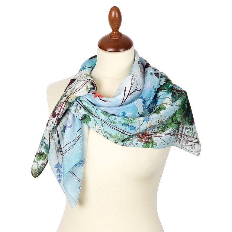 Платок из сказочного леса, где сквозь ветви и туманную дымку можно разглядеть грациозных пугливых оленят, а на верхушках деревьев сидят диковинные птицы, поющие на разные голоса; где на зыбких водах покачиваются кувшинки, а на берегах благоухают фиалки, покрытые каплями росы. Платок из сновидений и самых сладких грёз.