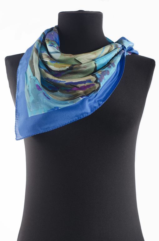 Нежный акварельный рисунок этого платка сочетает в себе как яркие синие, фиолетовые и оливковые цвета, так и нежные пастельные оттенки – бежевый, небесно-голубой, светло-сиреневый, белый. Платок универсальный за счёт своего размытого рисунка и обширной цветовой палитры, по стилю он похож на платок “Нюанс”, созданный той же художницей.