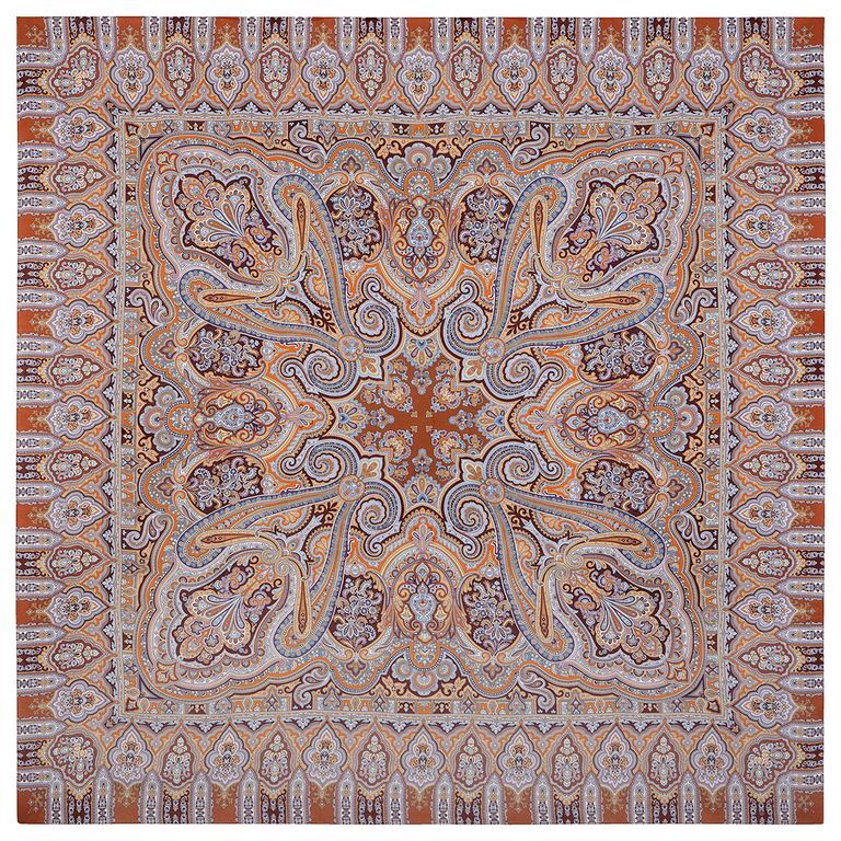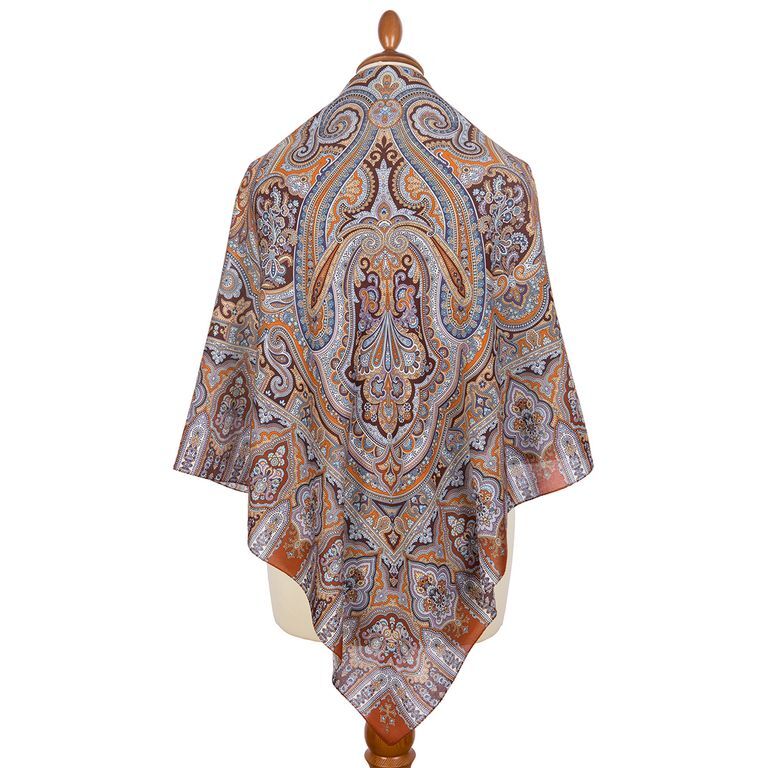 Теплый и уютный колорит в коричнево-рыжей гамме. Спокойный и выдающиеся платок в золотисто-коричневых оттенках, будто покрыт драгоценными самоцветами, которые таятся в потрясающем детализированном узоре. Тщательно проработанный орнамент с маленькими завитками в восточном стиле, великолепно насыщают композицию. Универсальный размер вискозного изделия, в намотке позволяет мягко и нежно драпироваться, создавая плавные складки и волны. Особенно хорошо платок сочетается с этническими образами, дополняя их красочными акцентами.
