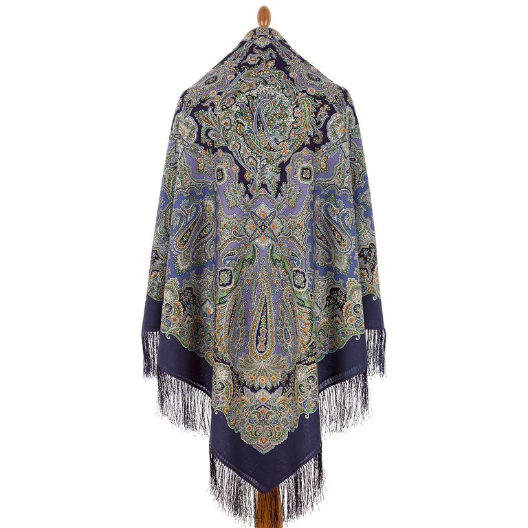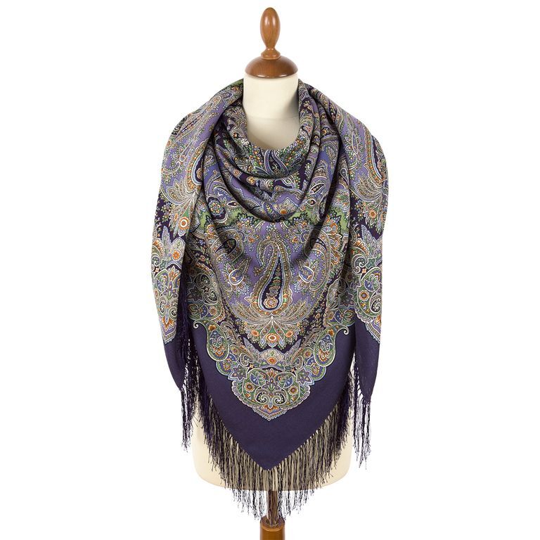 Орнамент завораживает и каждый элемент рисунка хочется разглядывать ещё и ещё. В утонченном узоре очень гармонично и нестандартно подобраны цвета. Самый спокойный среди линейки данных платков арт. 1934-14, 1934-16, 1934-9. Малахитовый зеленый очень интересно играет на темно-фиолетовом фоне платка, а использование белых, голубых и рыжих цветов создают эффект свечения!
