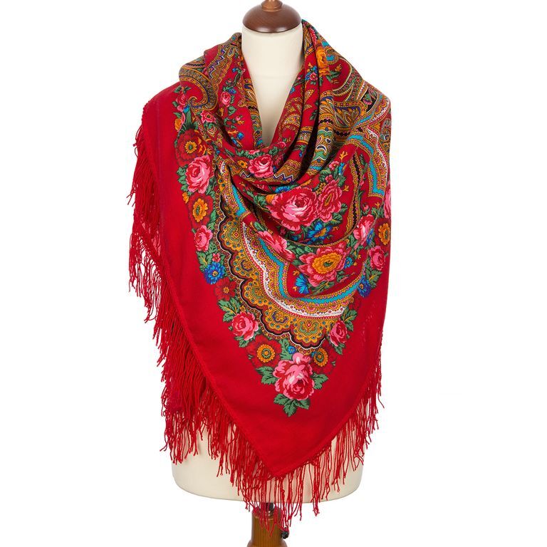 Фольклорные и такие родные мотивы на ярко-красном фоне навевают воспоминания о наших истоках: масленичные гуляния, зимние прогулки, ярмарки. Традиционные цветочные бутоны переплетаются орнаментальными мотивами, образуя образы выразительных кокошников. Платок очень полюбился гостям нашей необъятной родины.