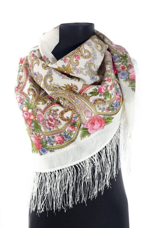 Сочетание золотых узорчатых переплетений создают неповторимые завитки и арки. Добавление композиции из ярко-розовых цветов и зеленых листьев оживляют платков, а полевые цветы добавляют живости и красочности изделию. Такой очаровательный и милый платок подойдет доброжелательным и искренним натурам.