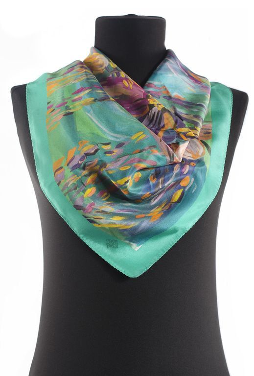Мягкий акварельный рисунок этого платка, тёплые оттенки зелени в сочетании с жёлтыми, розовыми и голубоватыми тонами, делают его очень жизнерадостным и милым, создающим игривое настроение. Размытые очертания цветов и вихревые потоки, изображенные художницей, придают рисунку динамики и энергии движения. Отличный акцентный аксессуар, который можно повязать на шею, вплести в волосы или поместить на ручку сумки.