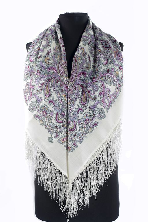 Изысканный и аристократичный платок с утончённым восточным рисунком. Помимо белого фона изделия, в нём использованы серо-голубые и розовые тона, окаймлённые чёрным контуром. Благодаря такому сочетанию, платок производит впечатление сдержанного и лаконичного аксессуара с ноткой романтики; он отлично подходит к минималистичным и деловым нарядам, а также к повседневным расслабленным образам с рубашкой и кедами.