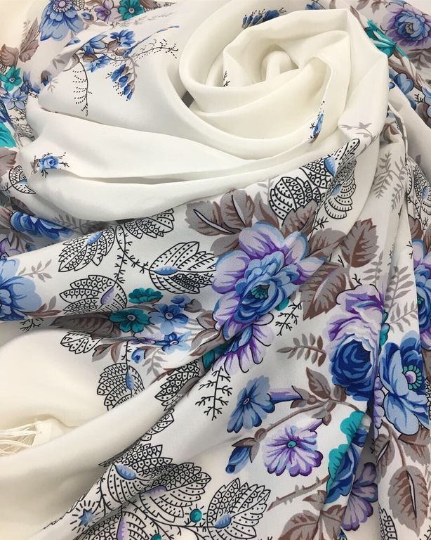 Легкий, струящийся шелковый платок невероятно комфортен для кожи! Нежный, мягкий, шелковистый - при носке это более ощутимо, если платок достаточно большого размера! Великолепное изделие, которое хорошо подходит под летнюю пору. Нежнейший колорит, белоснежное поле с цветочными букетами в голубых оттенках - словно гжельская роспись! Потрясающий размер, который невесомо ложась на плечи, словно окутывает в своих нежных объятиях.