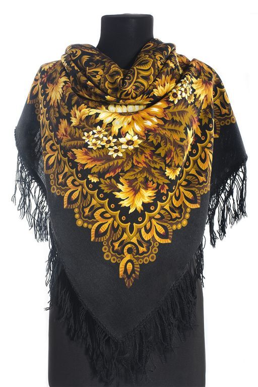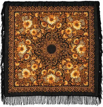 Один из самых узнаваемых платков Павловопосадской мануфактуры. Прекрасный орнамент напоминает кружевную резьбу по дереву на окнах в старых избах, а всё поле платка усеяно яркими подсолнухами – будто заглядываешь в бабушкин палисадник. От этого платка веет чем-то родным и очень тёплым, накидываешь на плечи, и уже уютно…