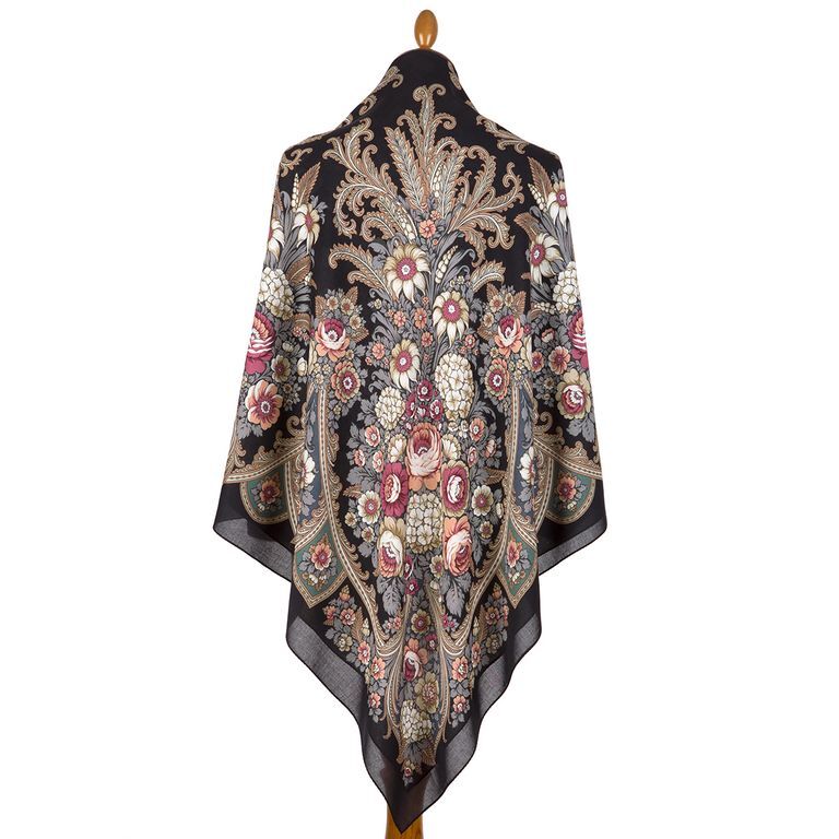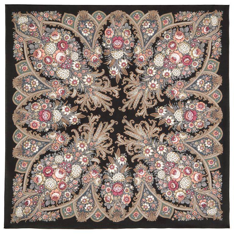 Мягкий и изысканный тон цветочного рисунка, в нежных, приглушенных бежевых оттенках пепельной розы. Утонченные узоры, шикарные букеты и богатый колорит красуются на черном фоне, придавая ему загадочности. Цветовое решение можно сравнить с неизменной классикой мануфактуры, платком “Молитва”. Схожесть тонов, единственное что роднит их - состав, бахрома и автор, пластика и рисунок разные, но такие красивые и душевные, что каждый сможет найти свой материал и фактуру по душе, что и является безусловным плюсом.
