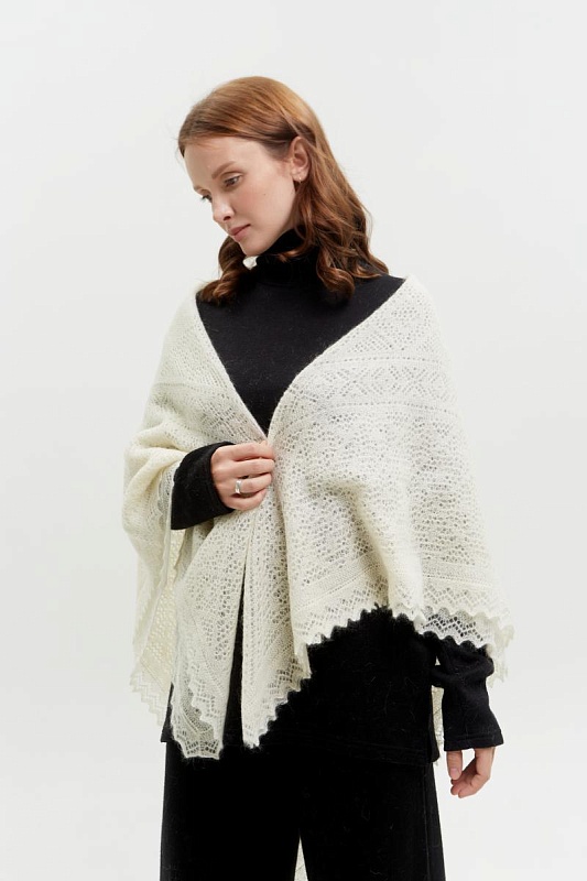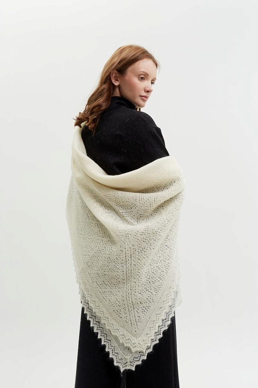 Красивая воздушная шаль в очень приятном цвете топленого молока. Имеет невысокий ворс и мягкую текстуру. Связана в традиционной для оренбургского платка манере. Носить желательно поверх верхней одежды, так как изделие достаточно объемное. Эта шаль чуть больше среднего размера позволит закрыть не только голову, а также грудь, спину и плечи. Согреет и защитит вас даже в самый крепкий мороз.
