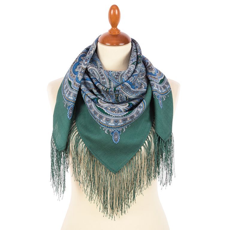 Нежный и спокойный платочек, выполненный в природных оттенках зелёного, голубого и серого цвета. Утончённый восточный рисунок дополнен мельчайшими соцветиями и растительными мотивами. Прекрасно освежает тон лица, не требует особого цветового подбора одежды и сочетается со многими стилями и оттенками. Небольшой размер изделия удобно носить в качестве шейного аксессуара, но и для повязывания на голову он тоже подходит.