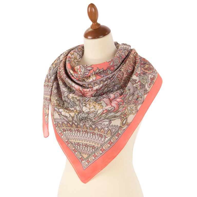 Схожий по цветовому сочетанию с шерстяным платочком “Праздничный город” 1921-3, прекрасная альтернатива на летний период, созданная Фаворитовой Еленой. Персиковые оттенки и рисунок, который буквально пестрит многообразием восточных орнаментов, которые деликатно сочетаются с небольшими цветами лилий и гвоздик. Абсолютно женственный и нежный колорит прекрасно дополнит образ в романтическом стиле.