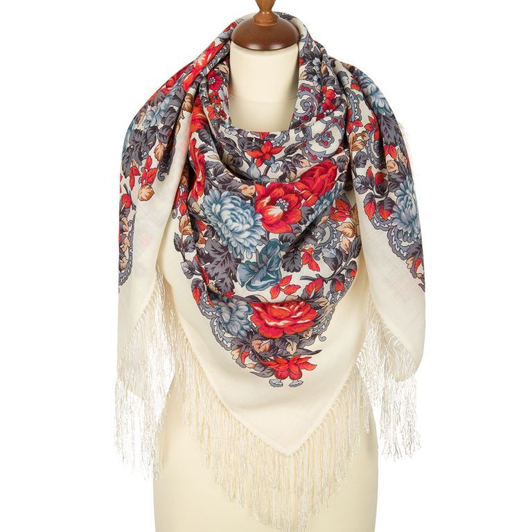 В этом нежном белопольном платке раскинулась целая цветочная феерия нежных серо-голубых астр и насыщенных красно-алых роз в сочетании обрамляющих их живописных листьев в приглушенном графитовом цвете! Уникальный рисунок изделия потрясающе сочетается с джинсовой тканью и подходит для каждодневной носки.
