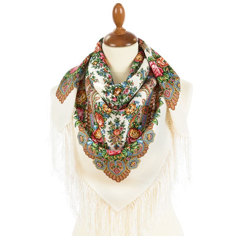 Летний колорит платка “Утренние грёзы” он яркий, сочный и живой. Смотря на него, у вас точно возникнут ассоциации с летним и теплым периодом. Цветы и зелень переплетающиеся в узоре, так и напоминают цветущую клумбу в маленьком уютном летнем саду. Маленькие и живописные розочки, будто кустовые, забавно выглядывают из-за сочных листьев. Несмотря на обилие цветов, платок вовсе не перегружен - за счет пустоватой серединки, именно она и создает воздушность и легкость.