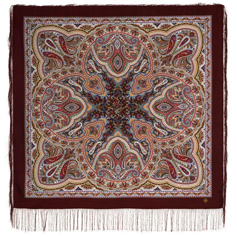 Платок будто соткан из дождевых струй стекающих во время непогоды по стеклу, Орнаментальные мотивы переплетаются в витиеватые узоры! А сочетание вишневого с серебристо-голубыми отблесками, создают впечатление будто мокрая черепица переливается под весенним дождем, Название изделия полностью воплощено в его изображении, а колорит придаст образу загадочности и элегантности.