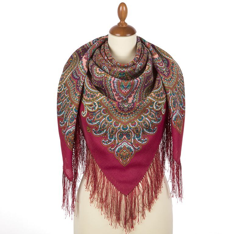 Спокойный платок в ягодных тонах с мелким рисунком, раскрашенным всеми цветами радуги. Не стоит бояться излишней пестроты изделия, ведь в нём использованы приглушенные, слегка припыленные природные оттенки, которые создают спокойное настроение. Это базовый аксессуар для использования в повседневной носке, его удобно брать с собой в поездки на случай непогоды, ведь натуральная шерсть отлично защищает от холода и ветра, в неё удобно укутаться на вечернем променаде у моря или в прохладном офисе.