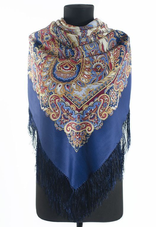 Данный платок уже много лет является хитом продаж и полюбился большому количеству наших покупательниц. Он яркий, харизматичный, универсальный и запоминающийся, в нём соединены самые популярные цвета – синий и бордовый, разбавленные мягким серо-бежевым фоном. На светлом фоне контраст изысканного восточного орнамента проявляет себя во всей красе, представая взору окружающих – остаётся лишь ловить восхищенные взгляды! Отличный вариант для подарка, когда сложно выбрать из многообразия рисунков, ведь этот платок подходит всем типажам и возрастам.