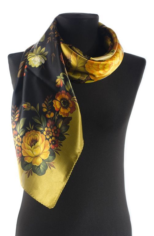 Фабрика позаимствовала потрясающую идею для платка, у другого народного промысла. Невообразимой красоты рисунок - творение потрясающего автора Шолоховой Татьяны. Рисунок платка полностью выполнен в канонах техники узоров жостовских подносов. Темный фон изделия с пышными и богатыми букетами, словно живых цветов, зелени и ягод. Закрытая цветочная композиция заключенная в форму квадрата, с золотисто-оливковыми переливами, солнечно-рыжими акцентами и контрастным фоном восхищает не только ценителей двух ремесел, но и наших дорогих покупателей!