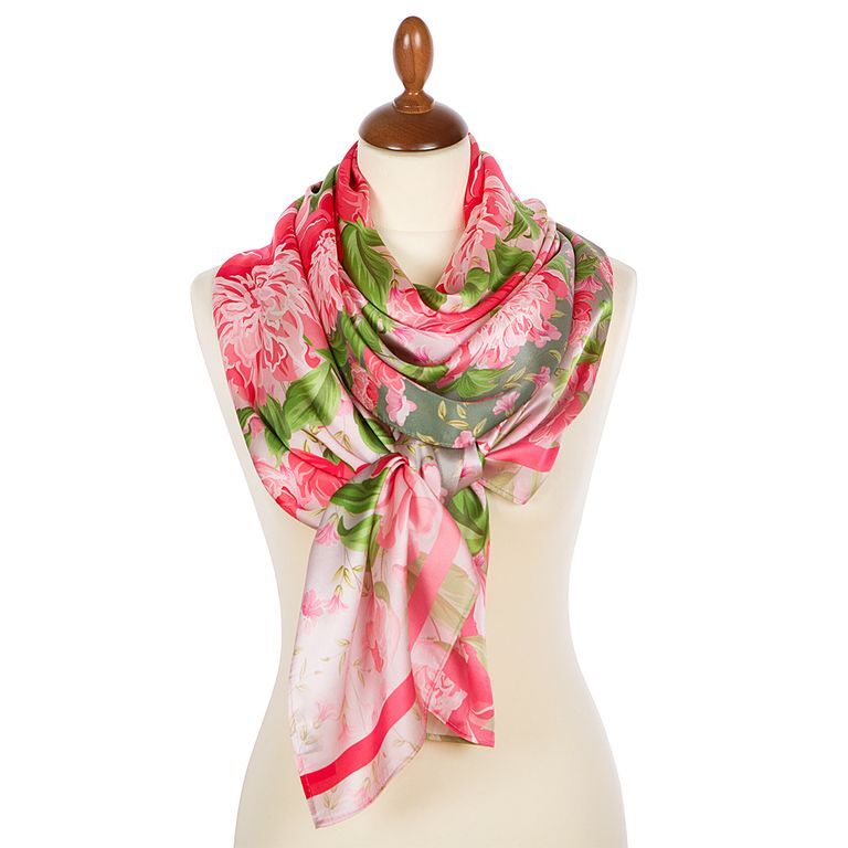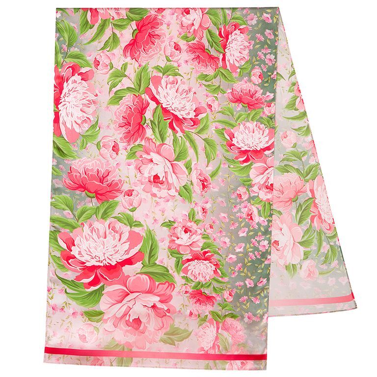 Пышные розовые пионы искусно распустились на шелке в нежно-зеленых тонах. Милые розовые вьюнки затейливо свисают словно лианы на своих изящных стеблях, а зеленые листья около пионов в таких насыщенных и ярких оттенках оживляет данную картину. Палантин отличается нежным перламутровым переливом, что сделает ваш облик незабываемым.