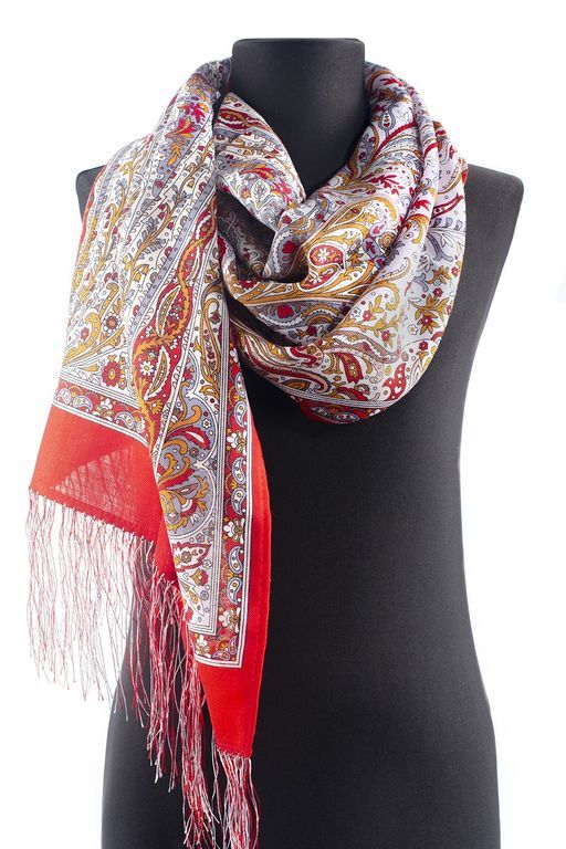 Изысканный шарф с нежным орнаментальным рисунком. Благодаря необычному сочетанию яркого алого и спокойного серо-голубого оттенков, уравновешивающих изделие, данный аксессуар не выглядит слишком вычурно и деликатно вписывается в праздничные и повседневные образы. Про него нельзя сказать, что он слишком яркий или слишком бледный – цвета шарфа гармонично переплетаются и дополняют друг друга, создавая аксессуар с неповторимым стилем.