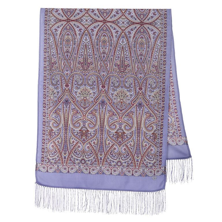 Шерстяной шарф в холодном сиреневом колорите с бордовыми прожилками орнамента. Выразительный, нежный и очень женственный, он удивляет обилием мельчайше прорисованных деталей в узоре, заполняющем всё поле изделия. Благодаря такому орнаменту, шарф неприхотлив в подборе вещей-компаньонов, одинаково хорошо сочетаясь с платьями и брючными костюмами. Тонкая шерсть отлично согревает и защищает от ветра, не создавая излишнего объёма, поэтому данный шарф удобно надевать под пальто или шубку.