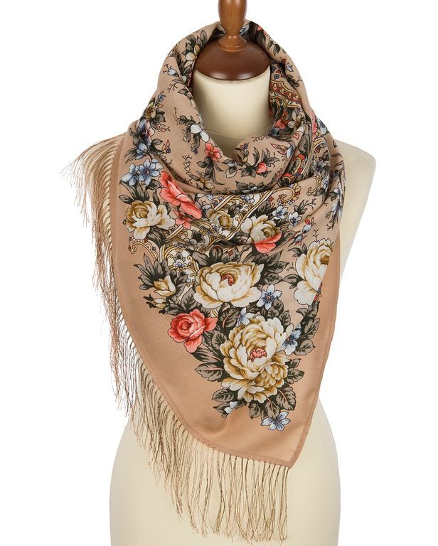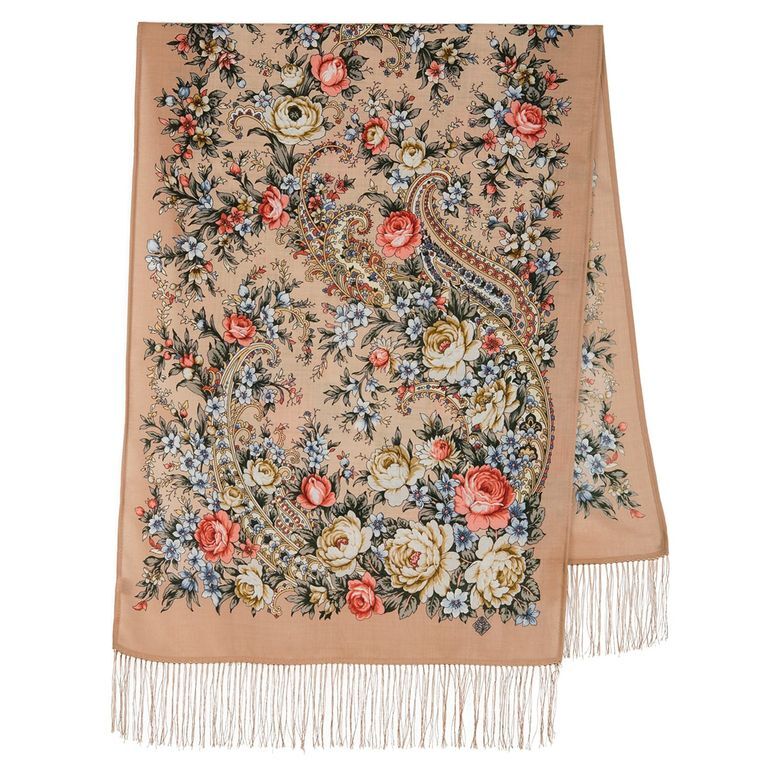 Единственный цветочный шарф из всей категории! На нежном фоне цвета кофе с молоком уютно расположились округлые бутоны роз и приглушённая листва, а восточный орнамент и мелкие соцветия добавили изделию изящности. Шарф очень женственный, красиво сочетается с романтичными образами, платьями и сарафанами, шубками и пальто приталенного силуэта. Данный размер шарфа удобно носить на шее, накидывать на плечи или голову.
